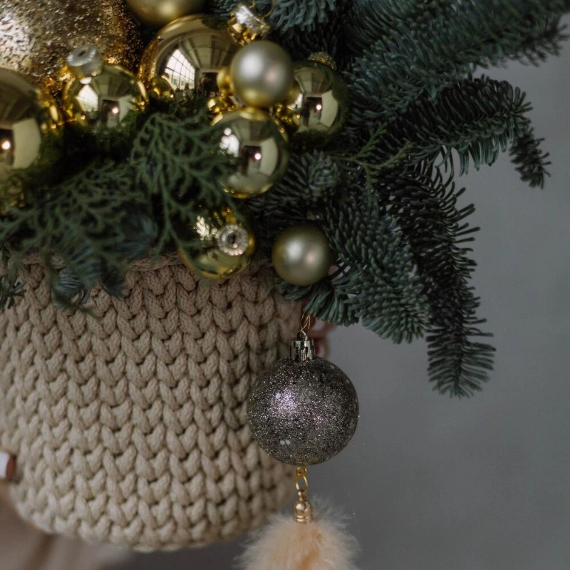 Новогодняя композиция из датского нобилиса в праздничными игрушками