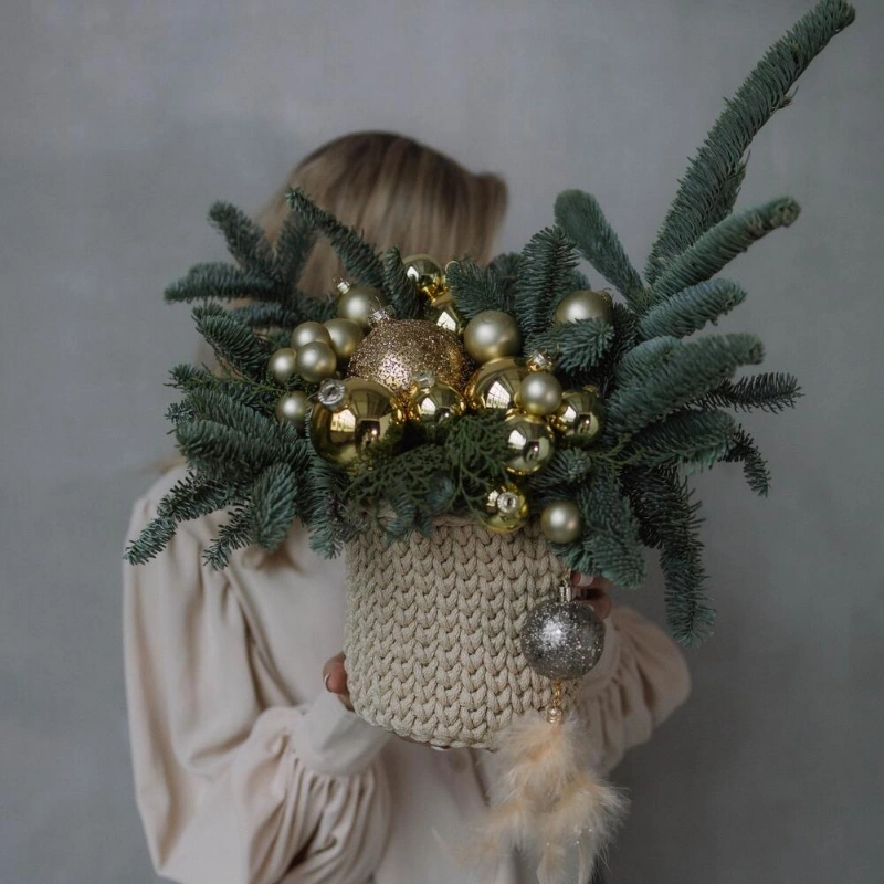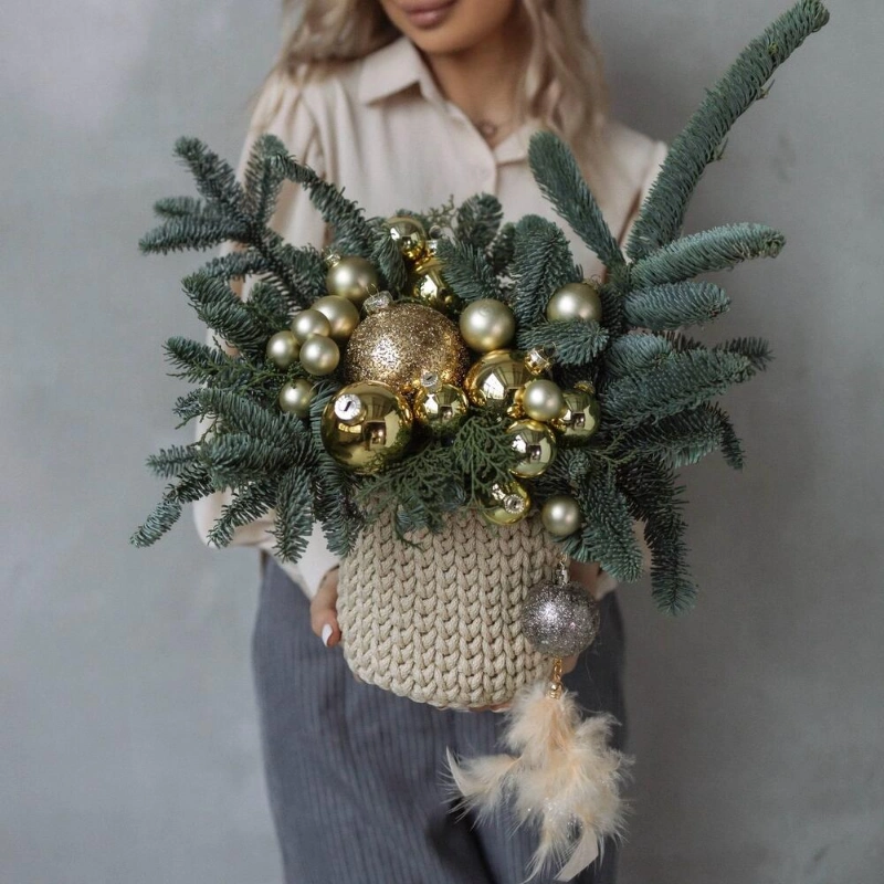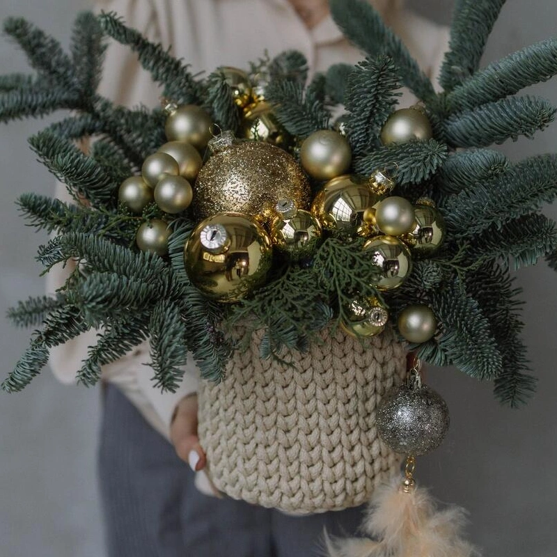 Новогодняя композиция из веток нобилиса с елочными игрушками
