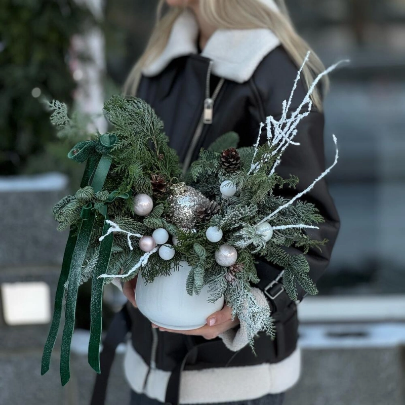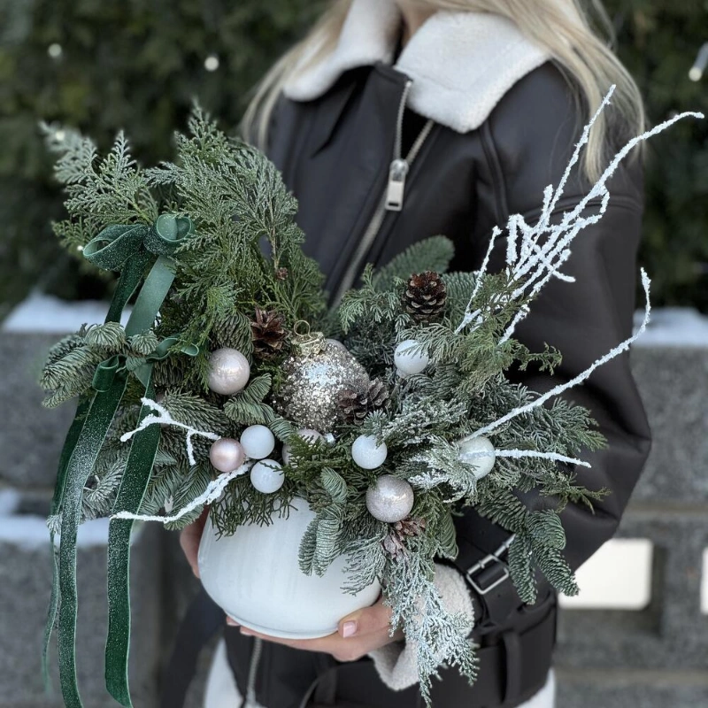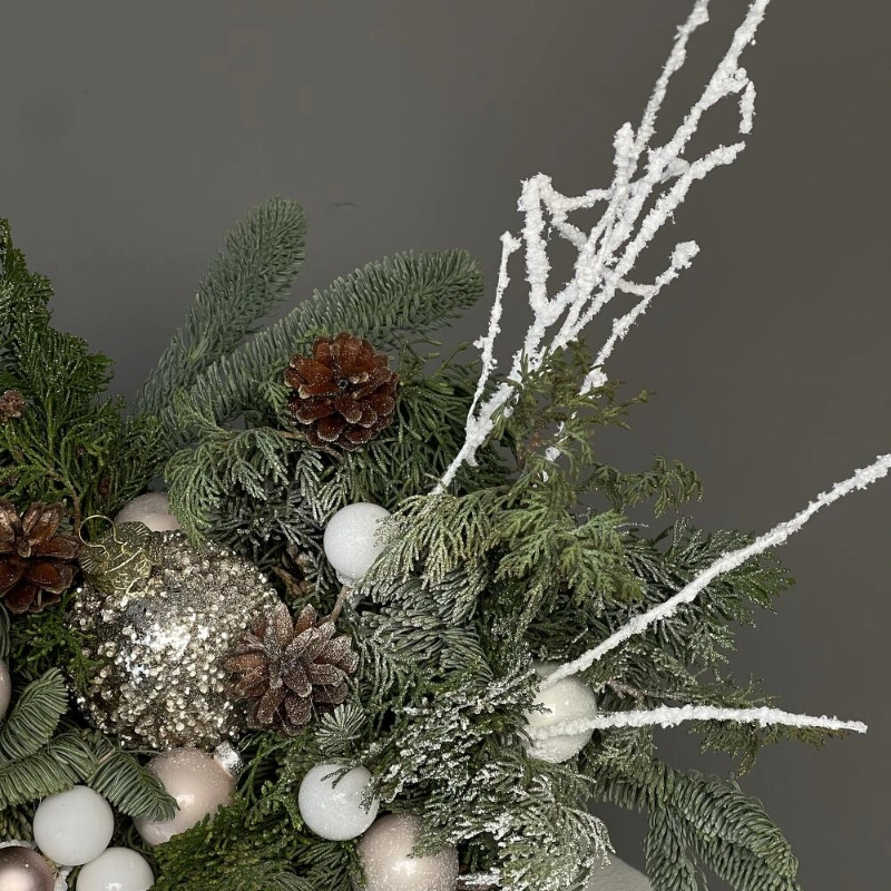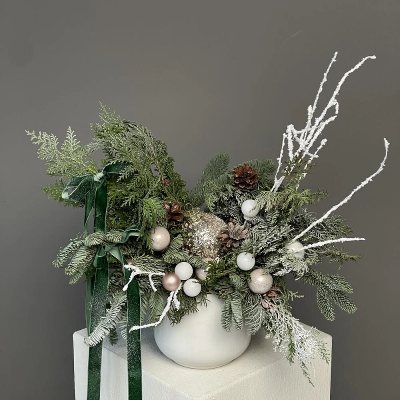 Эта новогодняя композиция сочетает в себе изысканную красоту датского нобилиса и праздничное настроение. В центре букета расположена яркая новогодняя игрушка, которая придает композиции особую атмосферу праздника. Датский нобилис добавляет зелень и свежесть, создавая ощущение зимнего леса. Игрушка украшена блестками и праздничными лентами, что делает её акцентом всей композиции. Комбинация нежных зелёных веточек и ярких декоративных элементов создает гармоничный и живой образ. Такая композиция отлично подойдет для украшения дома или подарка на праздники. Она прекрасно сочетает природу и праздничный декор, создавая теплую и уютную атмосферу. Этот букет станет ярким акцентом любой новогодней обстановки.