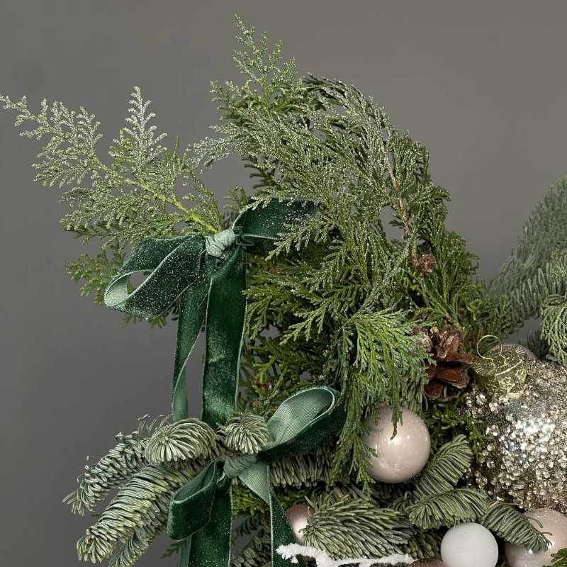 Новогодняя композиция из датского нобилиса в праздничными игрушками