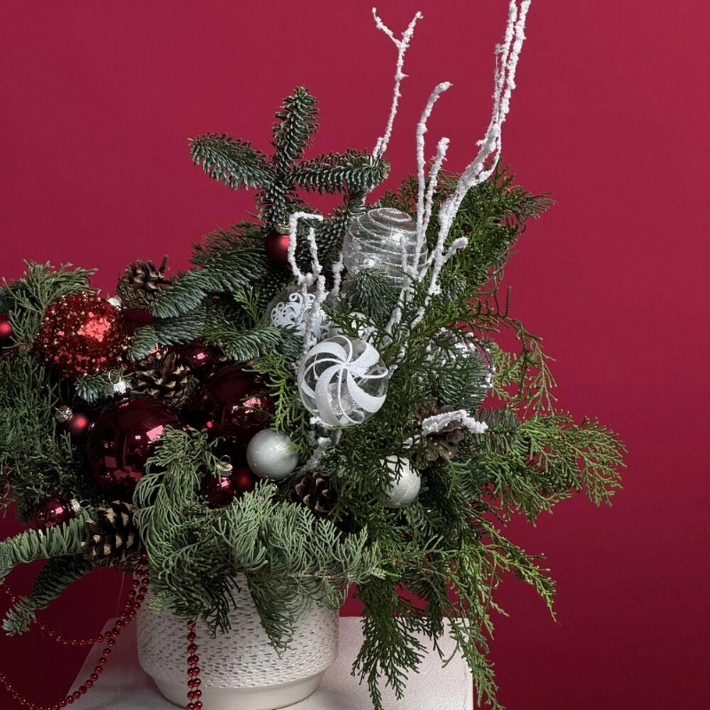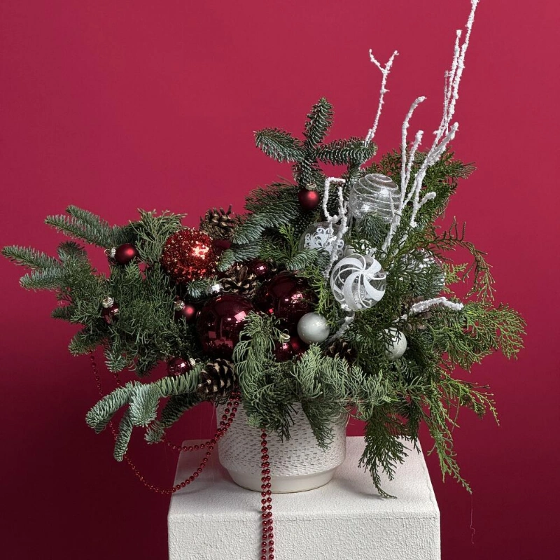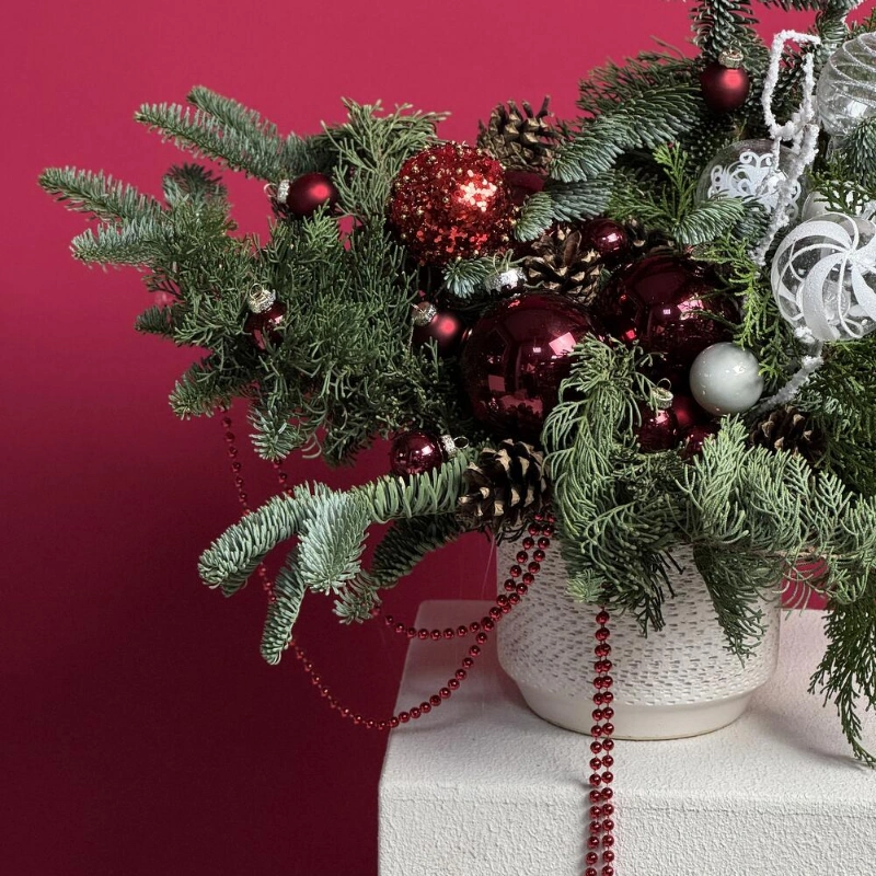 Авторская новогодняя композиция из нобилиса с бордовыми игрушками
