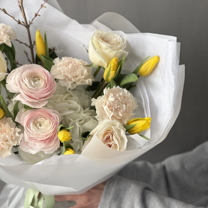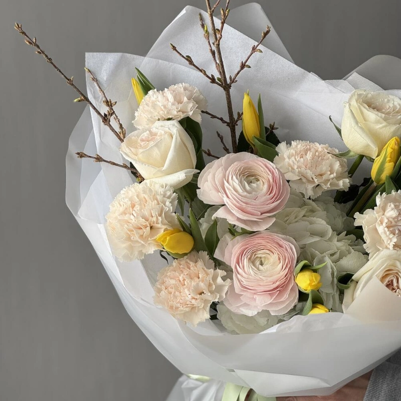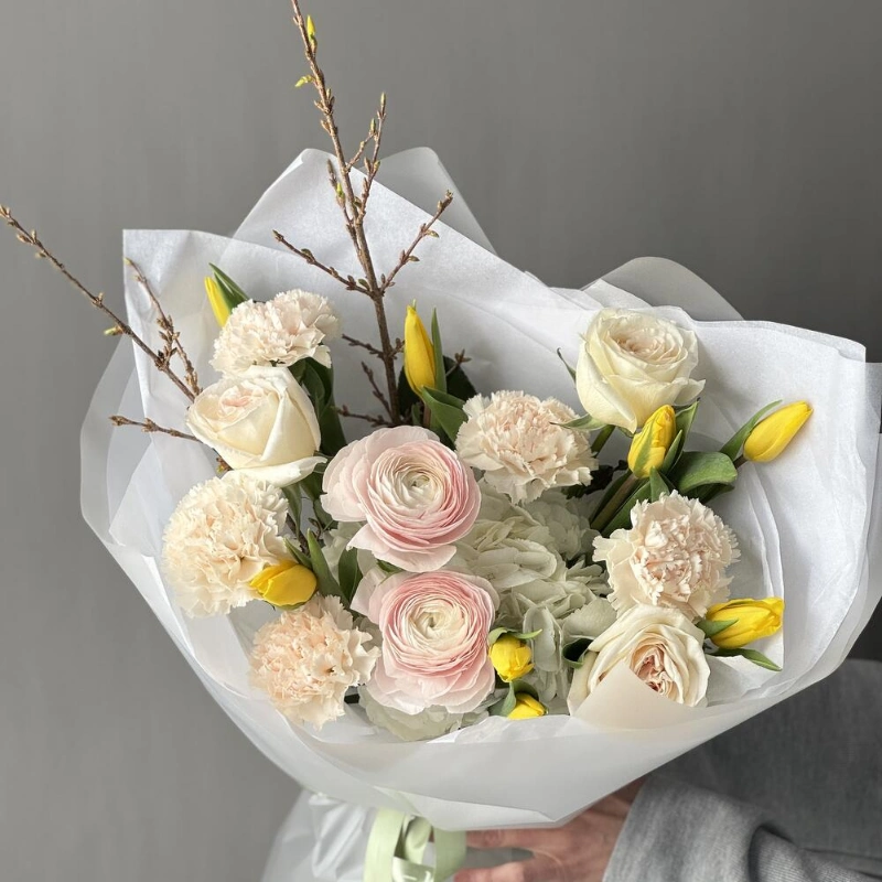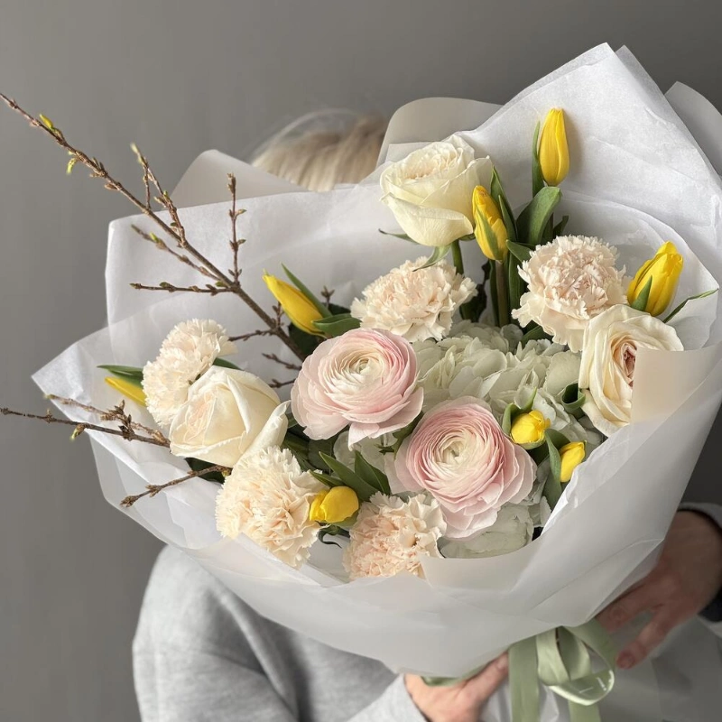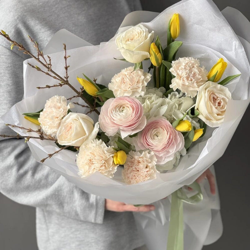 Весенний букет с ранункулюсами и форзицией — это изящное сочетание свежих цветов, которое наполнит любой дом уютом и цветочным ароматом. В состав входят нежные ранункулюсы, яркие гвоздики, романтичные розы, изысканные тюльпаны и пышная гортензия. Этот букет идеально подойдет для поздравлений или как символ весеннего настроения.