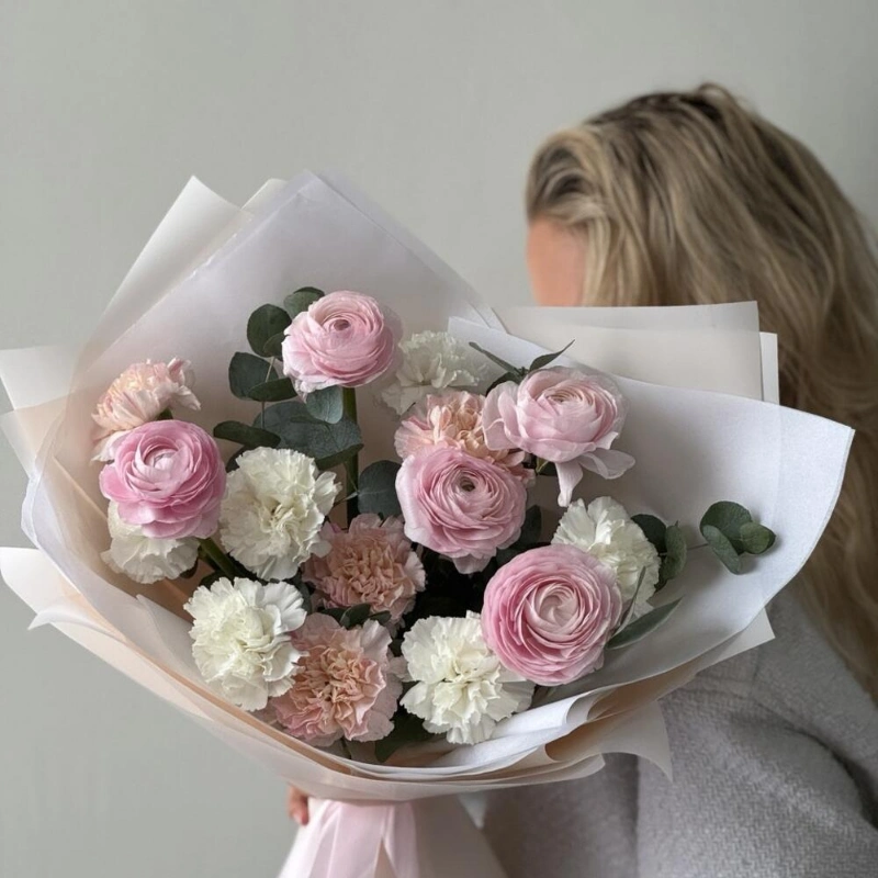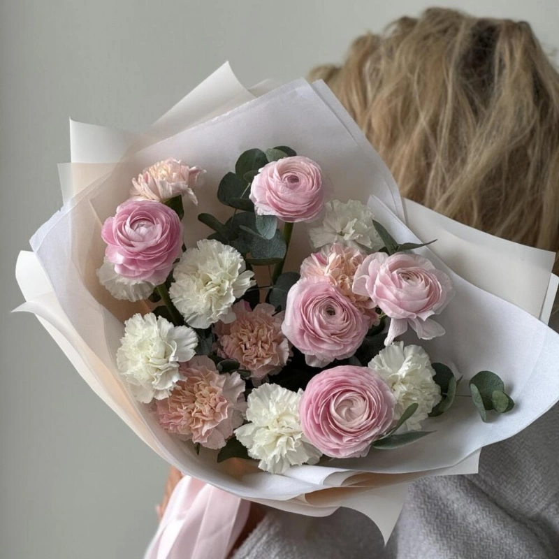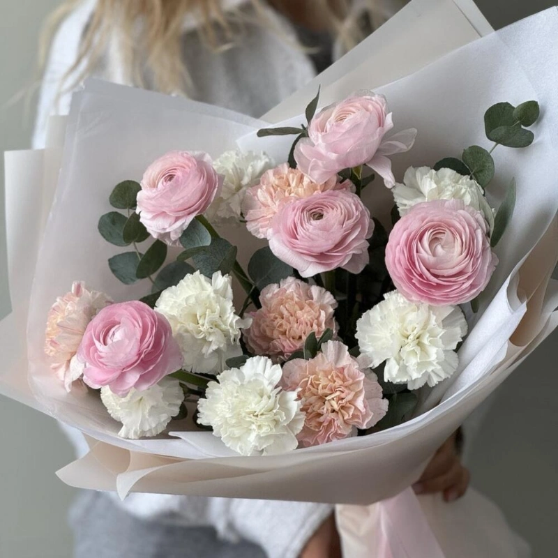 Авторский букет с сортовыми диантусами и ранункулюсами