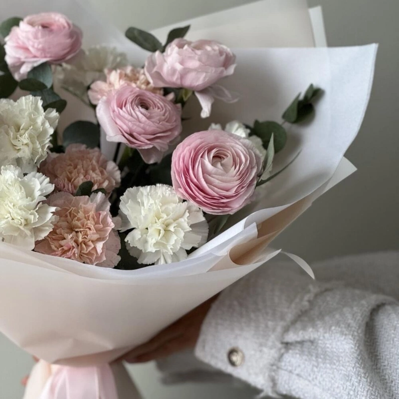 Ранункулюсы и эустома в нежной упаковке 🤍