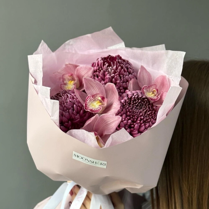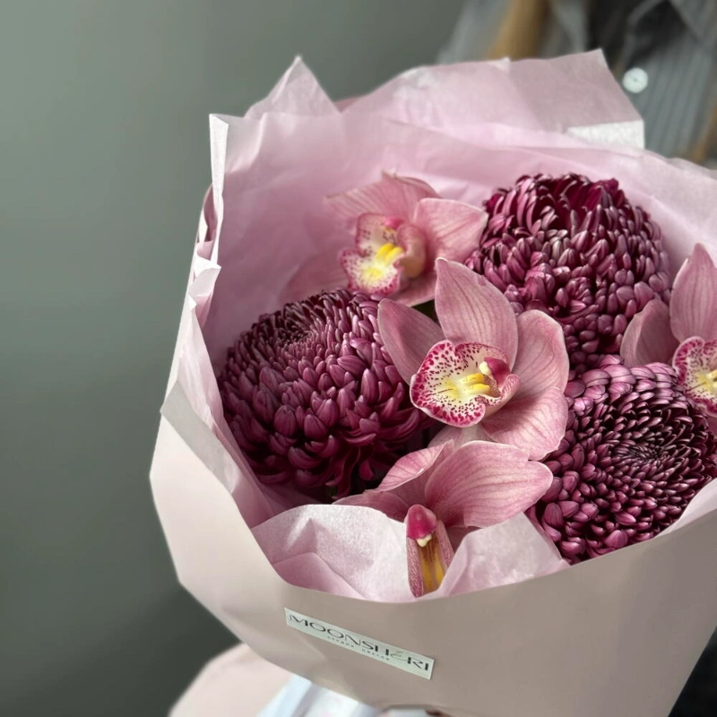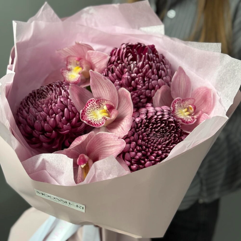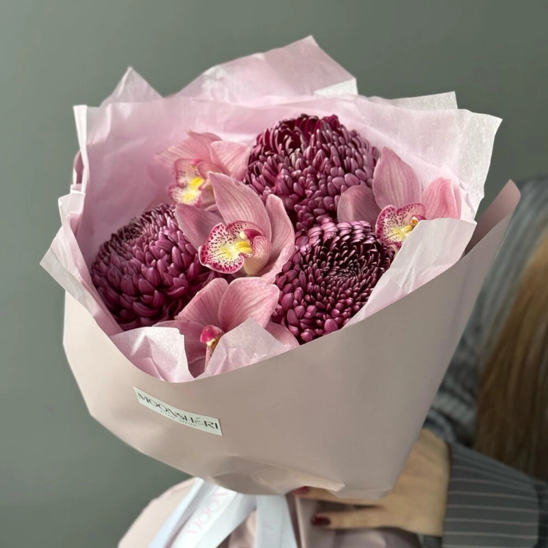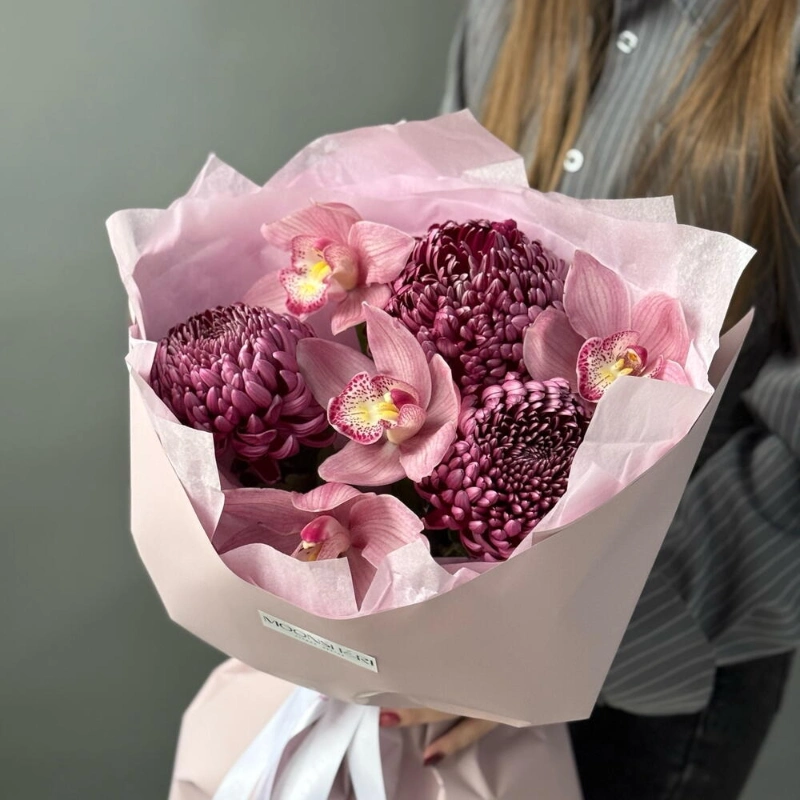 Нежно-яркий букет из орхидей и одноголовой хризантемы бигуди