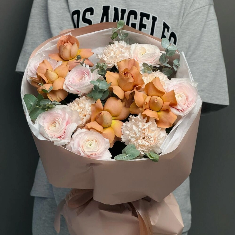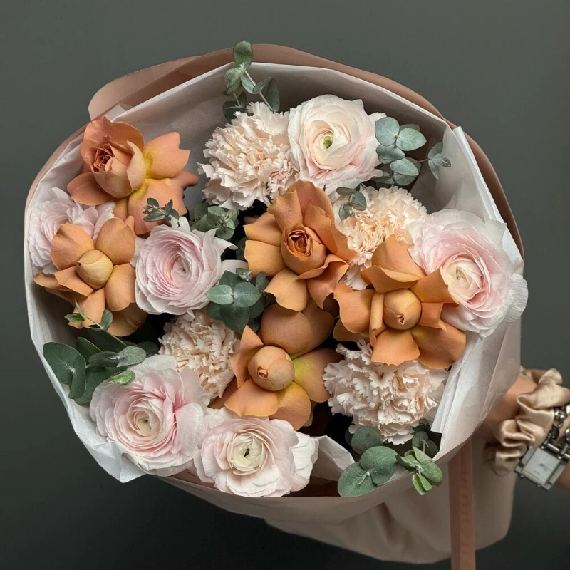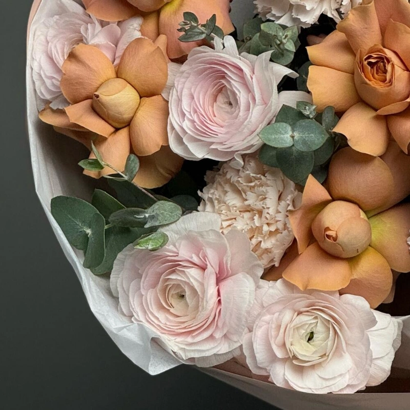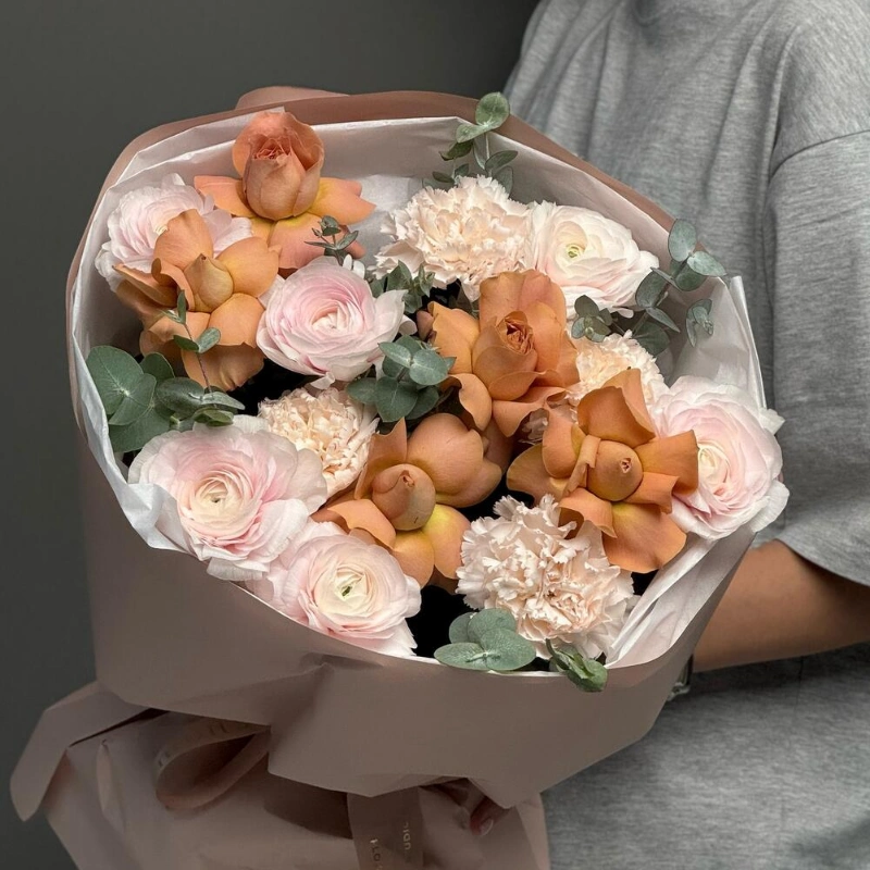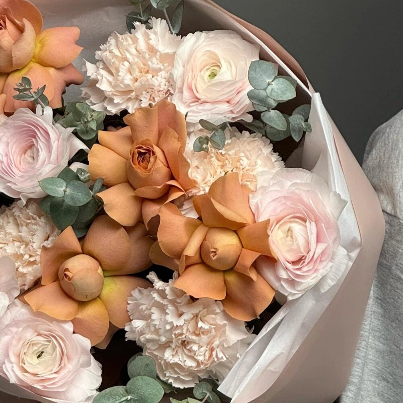 Этот изысканный букет создан для тех, кто ценит нежность и элегантность. В его составе нежные ранункулюсы, яркие лютики, изысканный диантус и свежий эвкалипт, которые создают гармоничное сочетание. В центре композиции расположены роскошные розы сорта Капучино, добавляющие уют и теплоту. Каждая цветочная деталь тщательно подобрана для идеальной гармонии и красоты. Такой букет станет прекрасным подарком на любой праздник или важное событие. Он поможет выразить искренние чувства и подарить радость. Отличный выбор для тех, кто хочет порадовать близких или украсить интерьер.