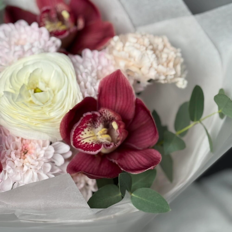 Авторский букет с сортовыми диантусами и ранункулюсами