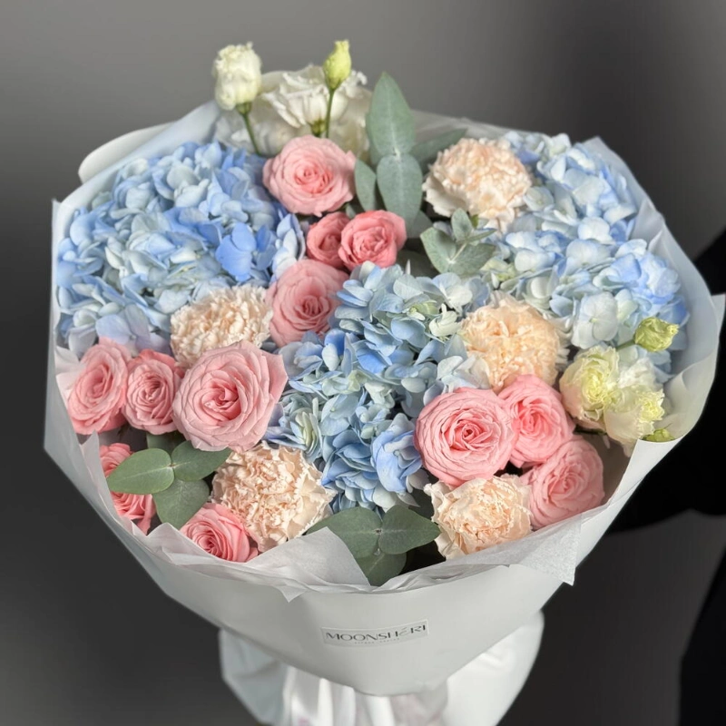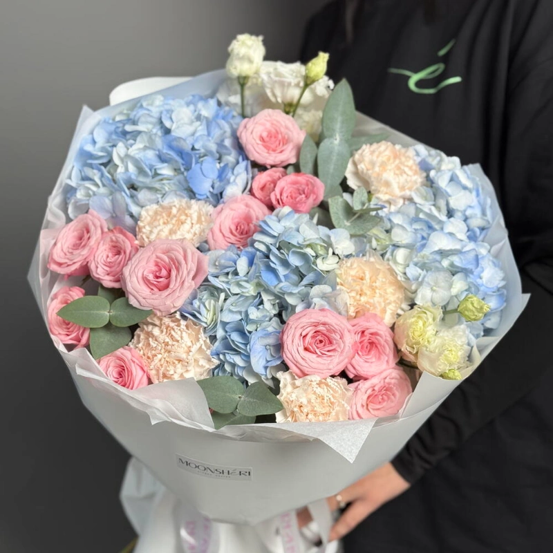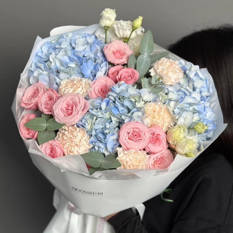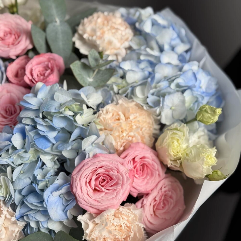 ГлавнаяКаталогБукетыГолубые гортензии и розовые кустовые розы