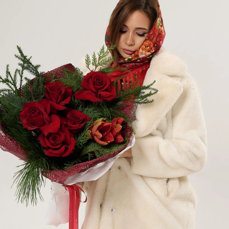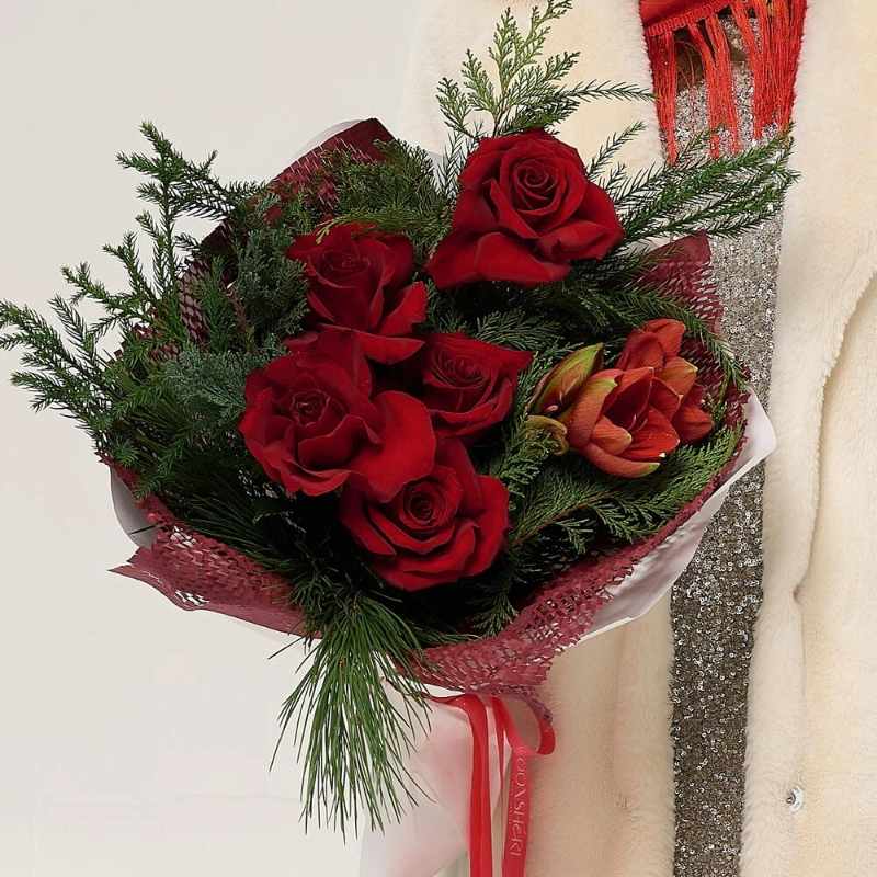 Элегантный зимний букет: красные розы, амариллис и хвойная зелень создают праздничное настроение.❤️