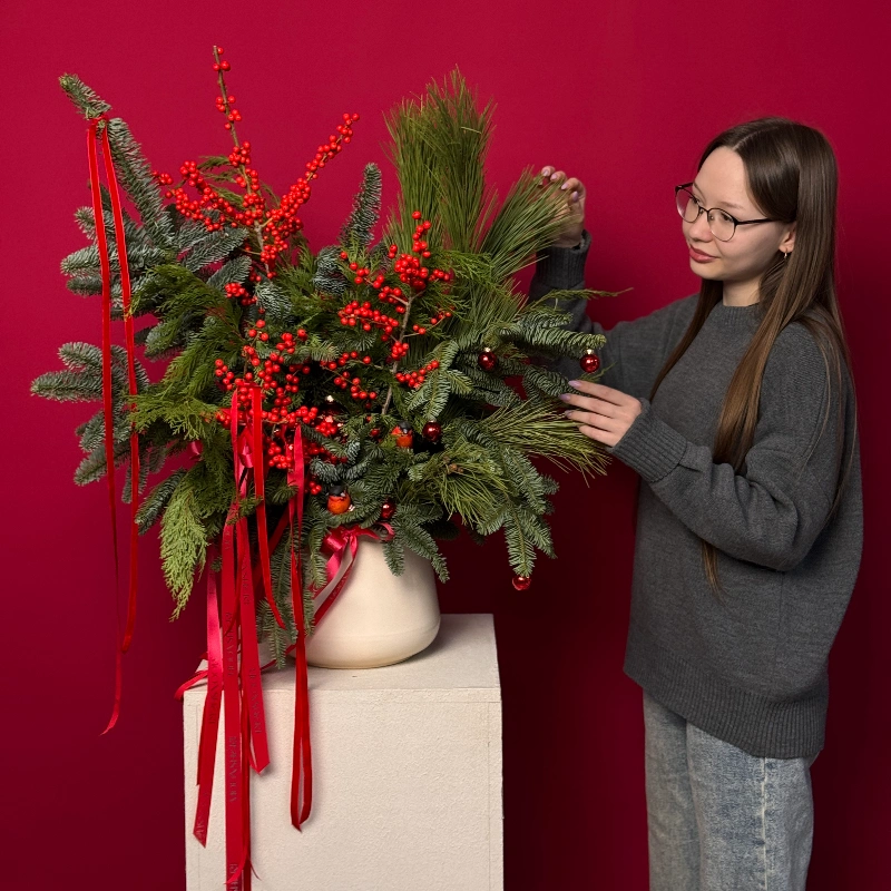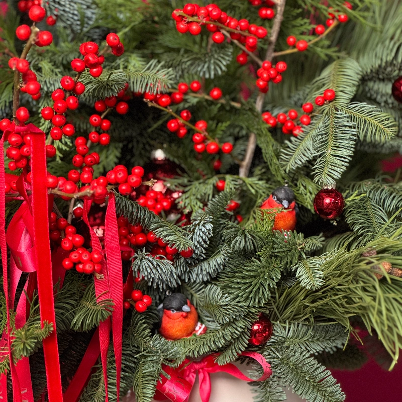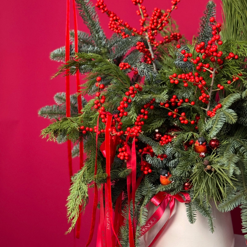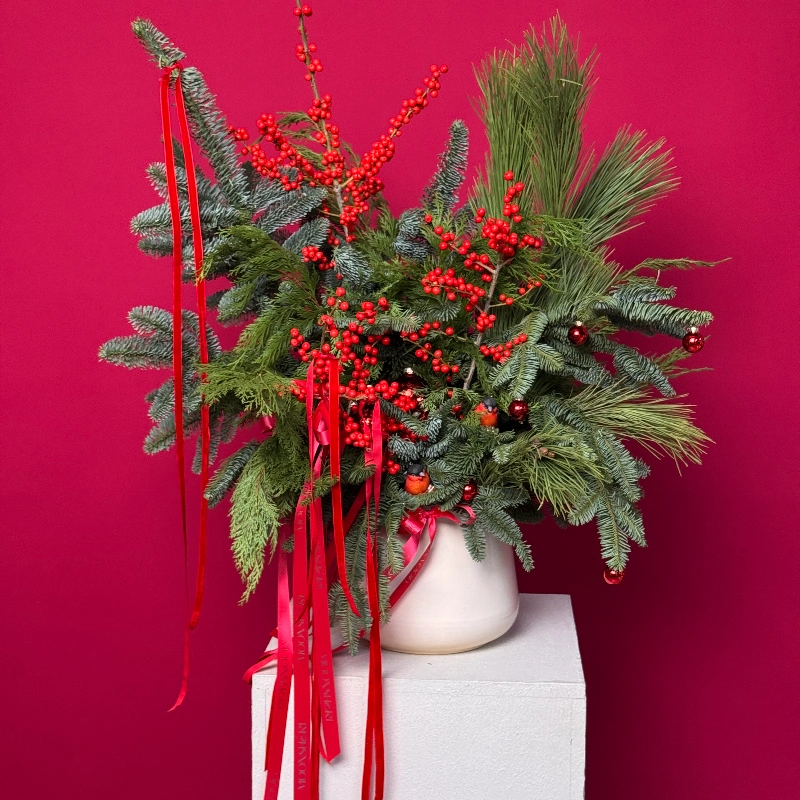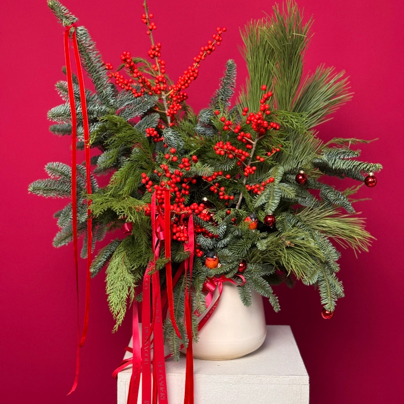 Зимняя композиция из еловых, пихтовых и сосновых веток с яркими красными ягодами, ёлочными шарами и фигуркой снегиря. Дополнена длинными красными лентами, размещена в светлом керамическом кашпо. Создаёт праздничное, морозное настроение❤️🎄