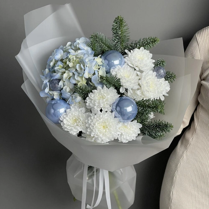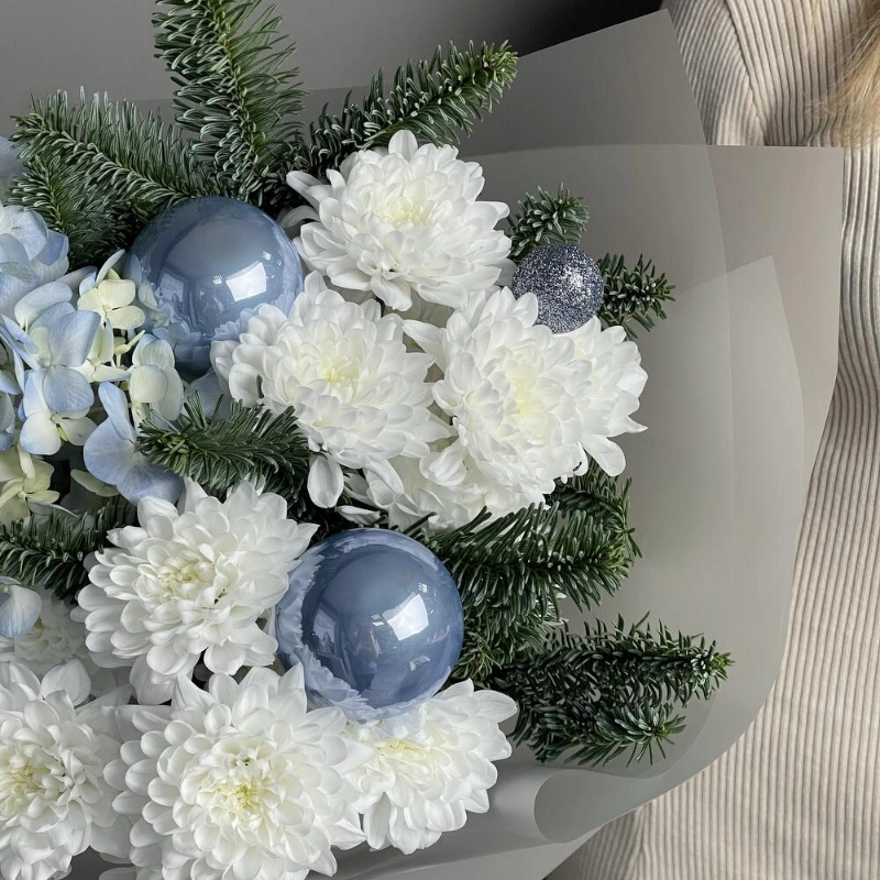 Этот букет — настоящее воплощение нежности и элегантности. Голубая гортензия, с ее пышными и мягкими соцветиями, создает ощущение легкости и воздушности. Кустовая хризантема добавляет композиции яркости и разнообразия, подчеркивая ее уникальность. Нобилис создает контраст и добавляет текстуру. Голубые елочные игрушки, которые переливаются и блестят, словно драгоценные камни, добавляют композиции праздничного настроения и подчеркивают ее изысканный стиль. Этот букет — идеальный выбор для тех, кто ценит красоту и уникальность в каждом элементе декора.