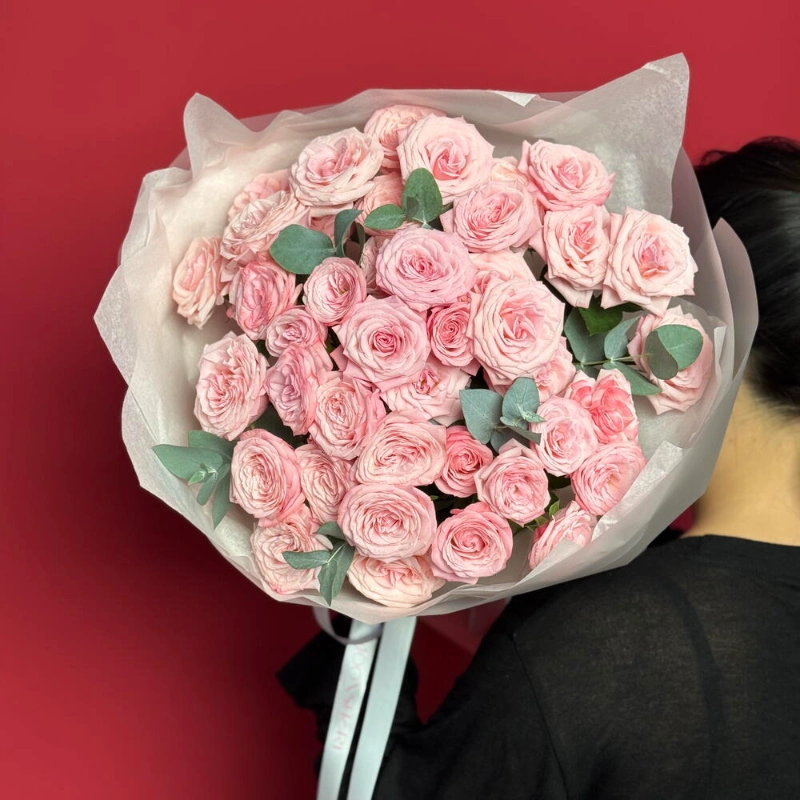 Букет с кустовыми розами и эвкалиптом