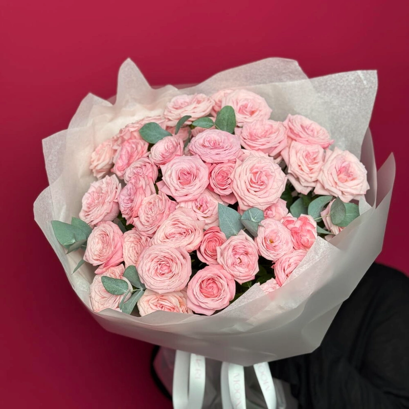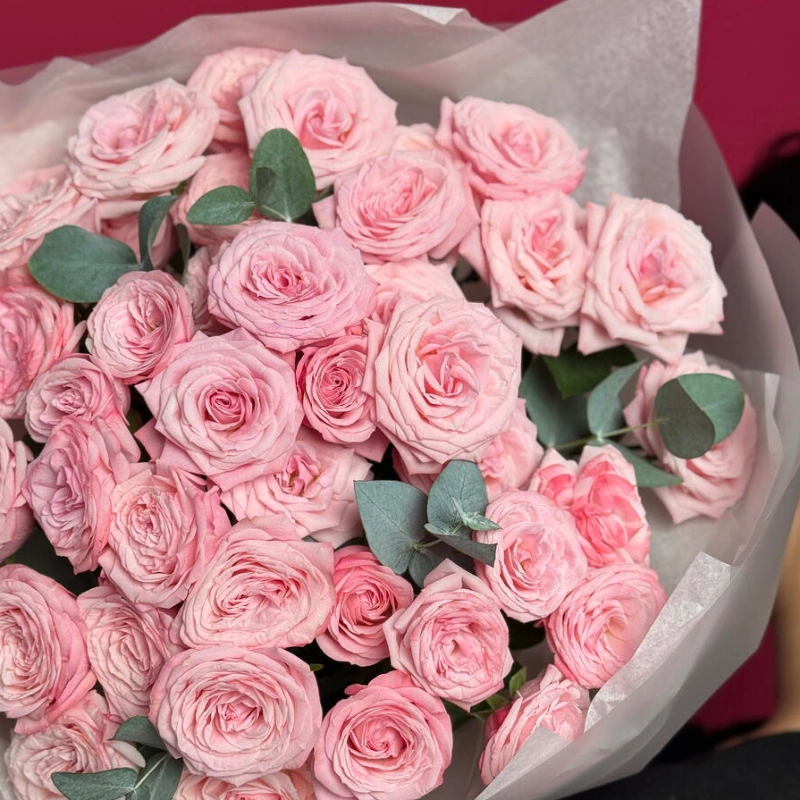 ГлавнаяКаталогРозыБукет с кустовыми розами и эвкалиптом
