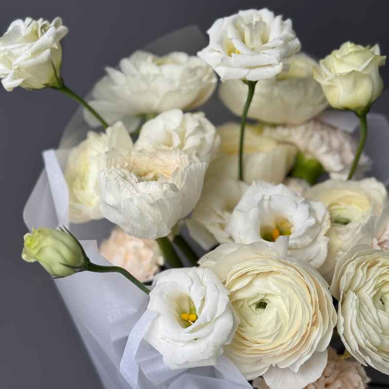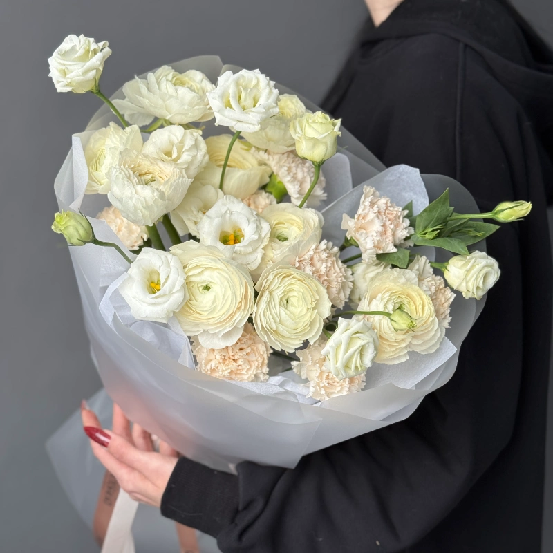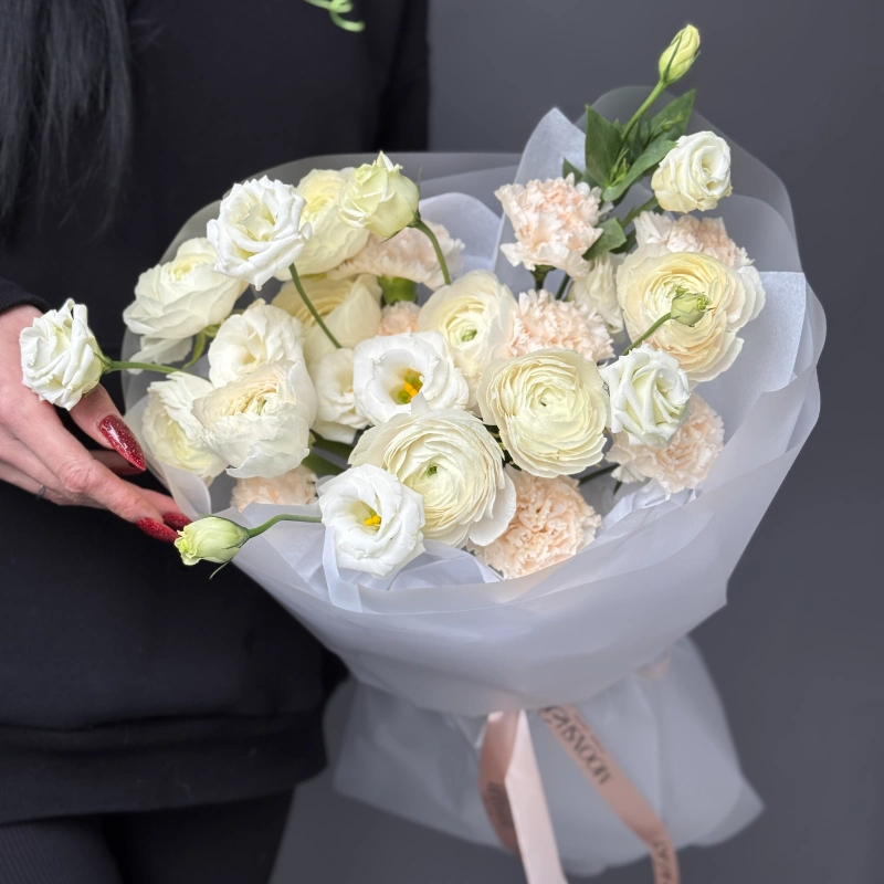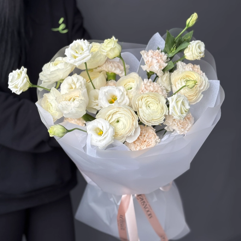 Нежный букет в пастельных тонах: изысканное сочетание ранункулюсов, эустомы и кремовых гвоздик. Лёгкая полупрозрачная упаковка подчёркивает утончённость композиции.