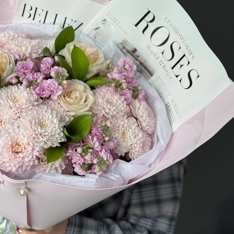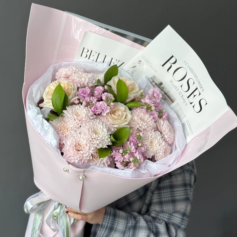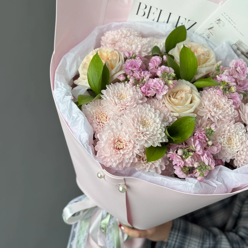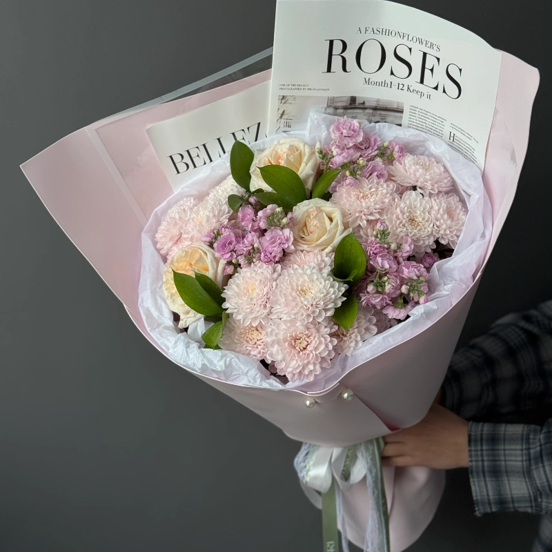 🌸 нежный букет в пастельных тонах: кремовые розы, розовые хризантемы и изысканная зелень. Элегантная упаковка с жемчужными деталями и стильными лентами — готовый подарок для любого повода! свежесть, утончённость, безупречный стиль. Закажите сейчас — порадуйте себя или близких! 💧✨