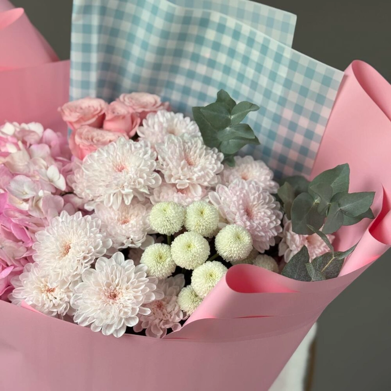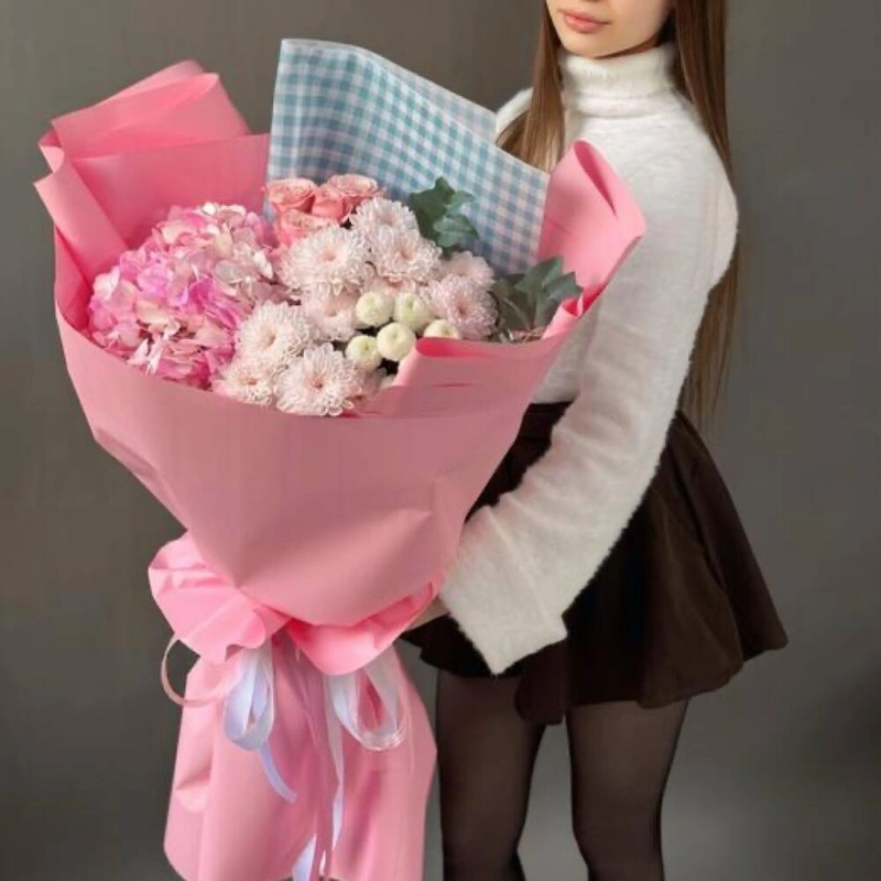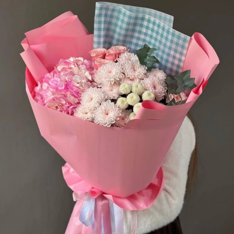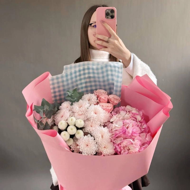 Роскошный букет‑гигант в нежных розовых тонах — воплощение трепетных чувств и искренних эмоций. Пышные соцветия гортензии переплетаются с благородными хризантемами, создавая гармоничную композицию, от которой невозможно отвести взгляд. Идеальный подарок для тех, кому хочется сказать: «Ты — моя самая нежная мечта».