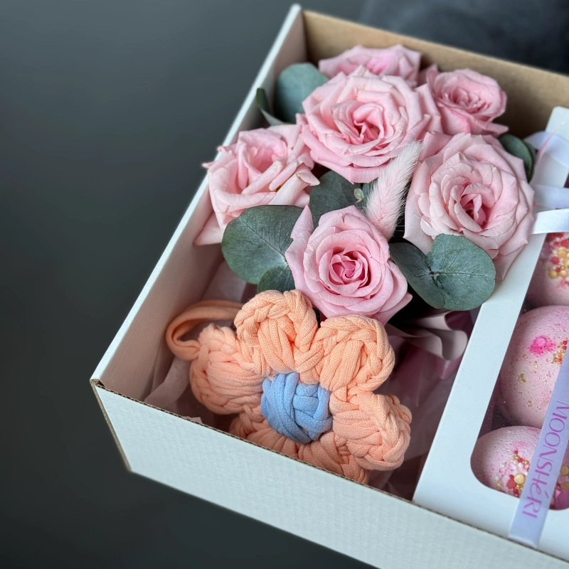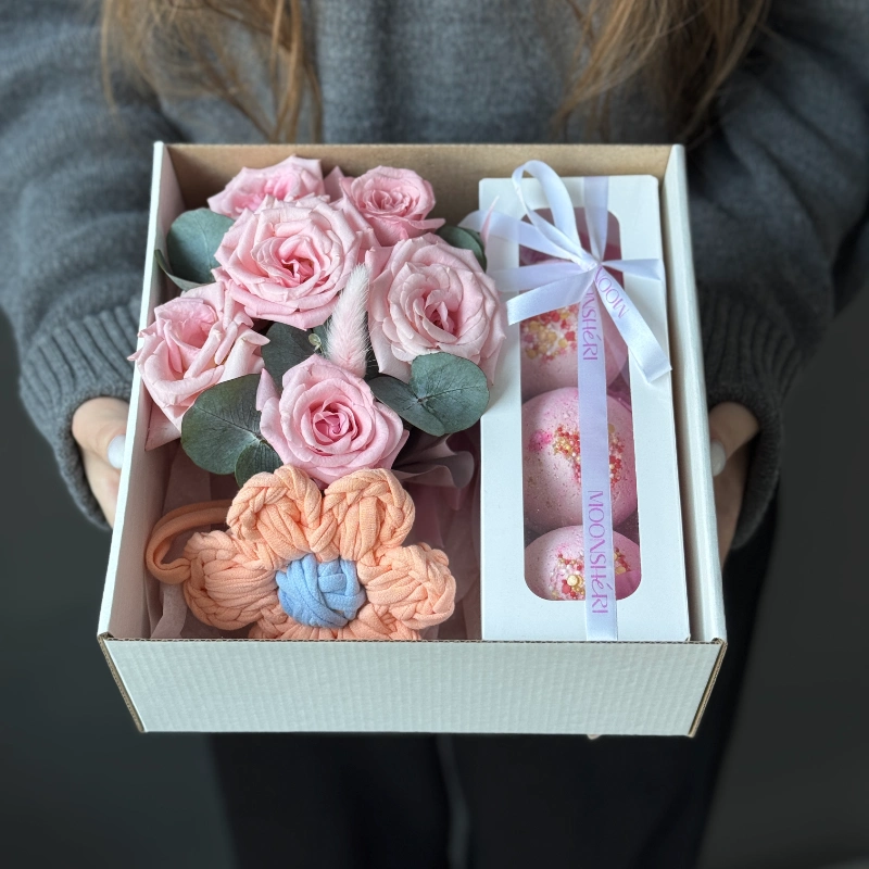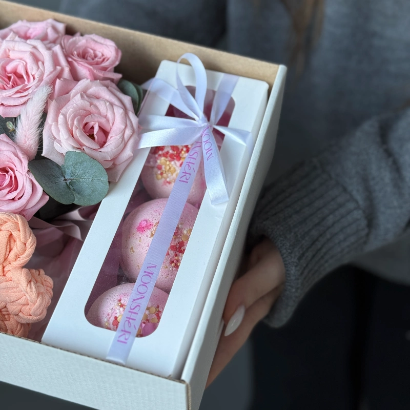 Изысканный подарочный бокс — гармония природы и ручной работы. Нежные кустовые розы в сочетании с эвкалиптом создают утончённый ансамбль. Дополняют композицию уникальные подарки: брелок‑цветок и ароматные бомбочки, сделанные вручную. Идеальный подарок для тех, кто ценит эстетику и внимание к деталям.