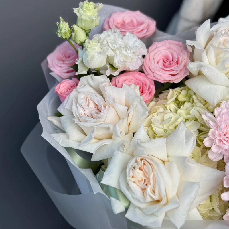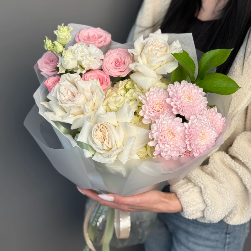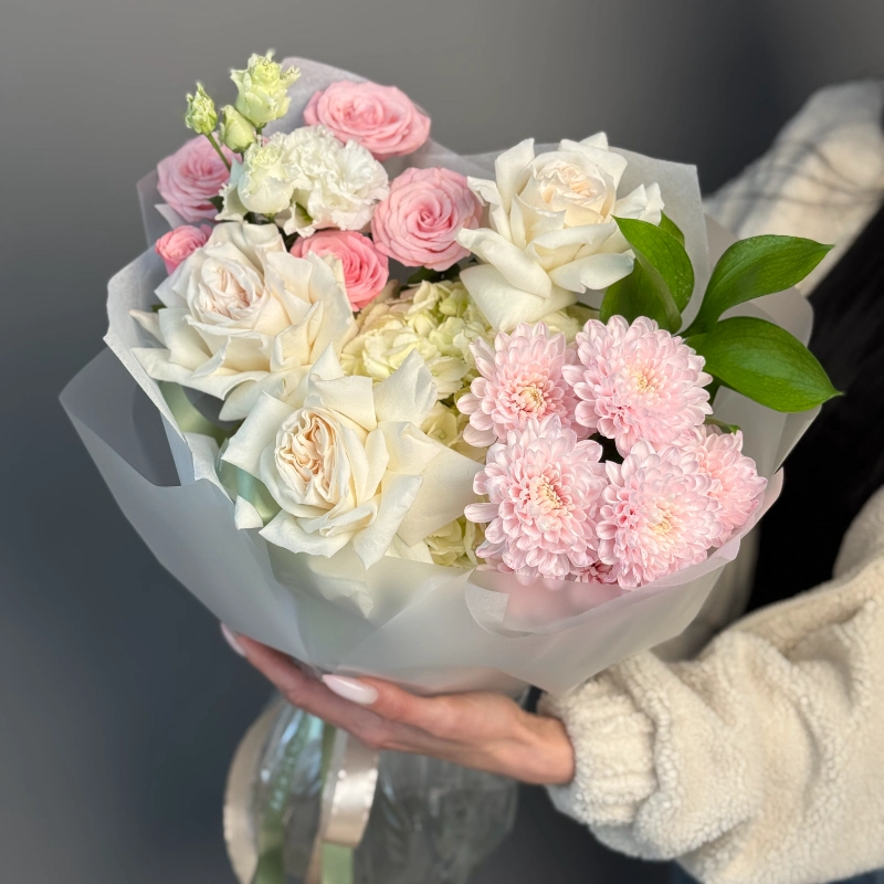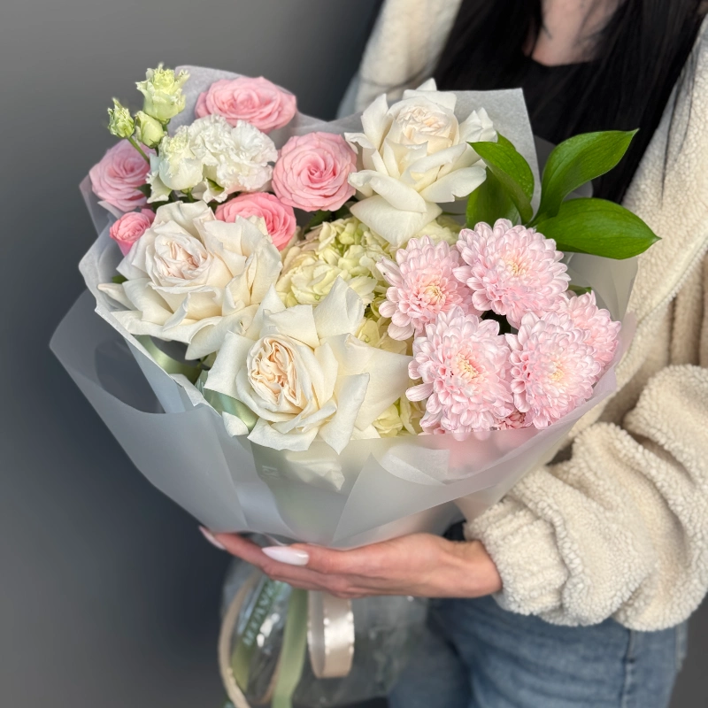 Нежный букет в пастельной гамме — воплощение весенней утончённости. Бело-розовые розы создают основу композиции, дополненные пышными нежно-розовыми хризантемами и изысканными соцветиями эустомы. Лёгкая упаковка подчёркивает воздушность букета, а сочная зелень добавляет свежести. Идеальный выбор для романтичного подарка или украшения торжественного события