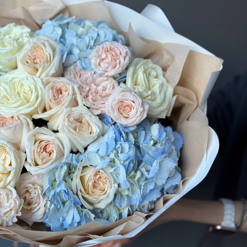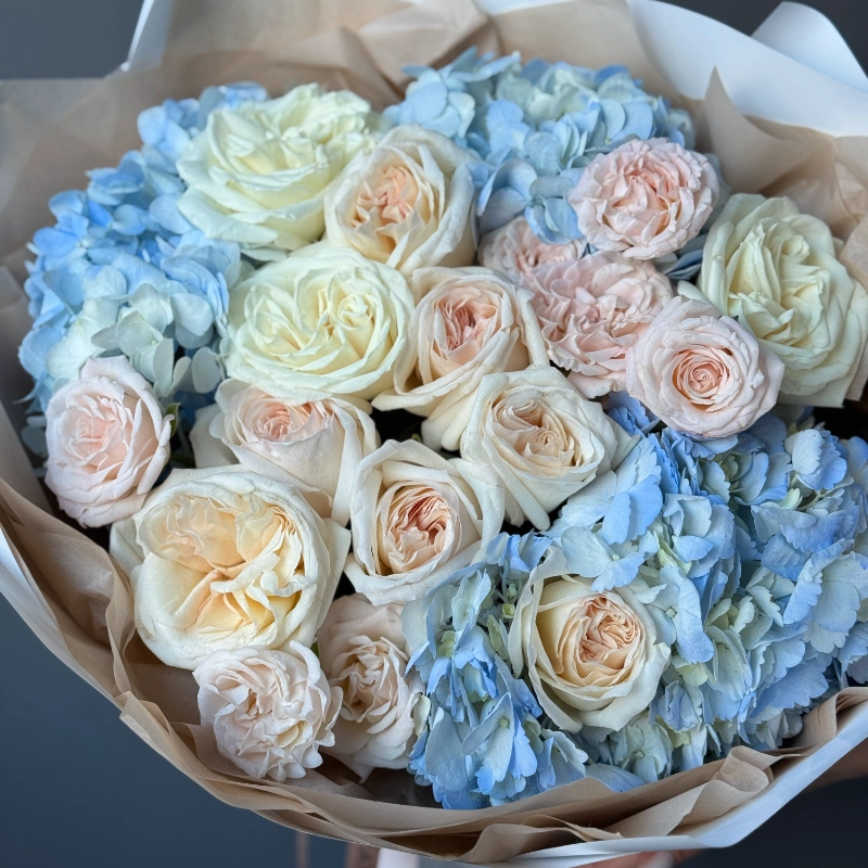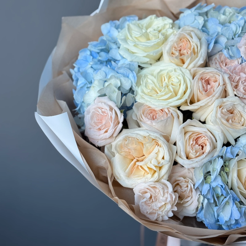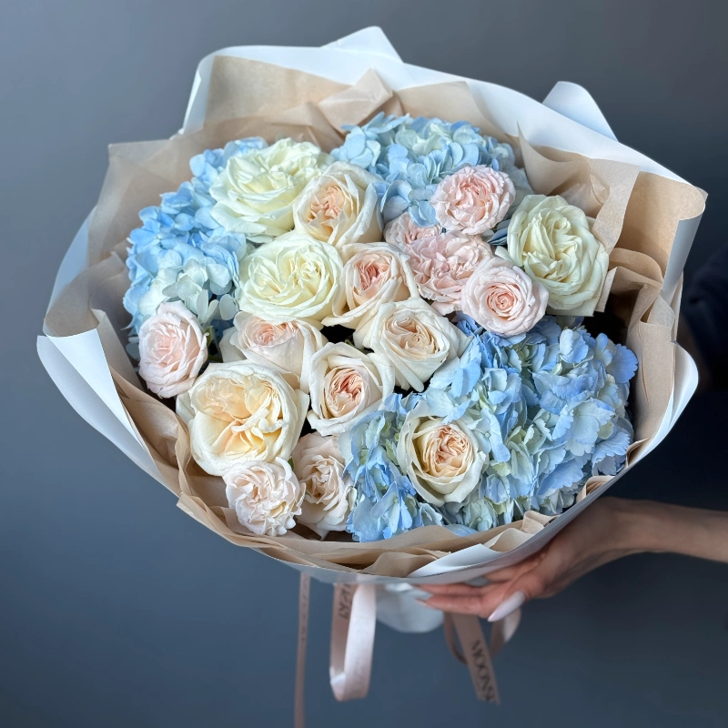 Нежный букет в пастельной гамме: кремовые и нежно-розовые кустовые розы гармонично сочетаются с пышными соцветиями голубой гортензии. Лёгкая упаковка в бежево-белых тонах подчёркивает утончённость композиции. Идеальный выбор для романтичного подарка или украшения торжественного события