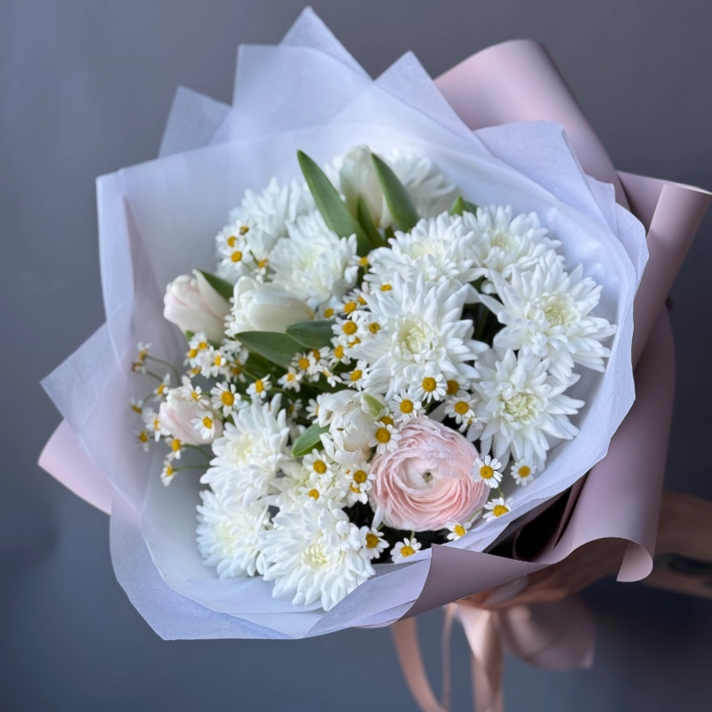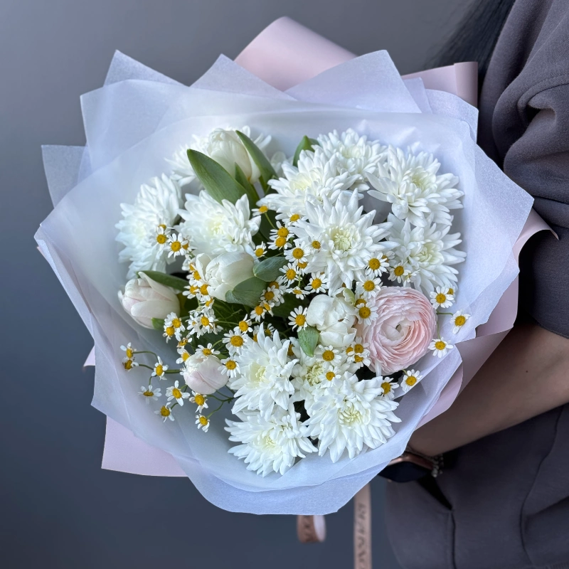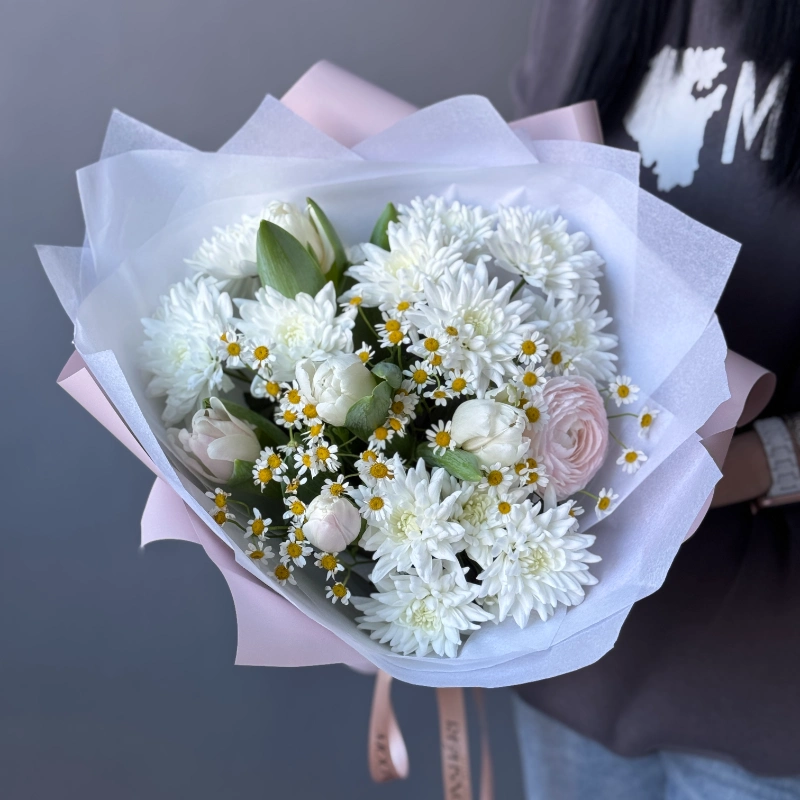 Нежная симфония чистоты и свежести: белые хризантемы создают основу композиции, дополненные изящными белыми тюльпанами, романтичным розовым ранункулюсом и россыпью очаровательных ромашек. Лёгкая упаковка в пастельных тонах подчёркивает утончённость букета. Идеальный выбор для торжественного момента или искреннего признания