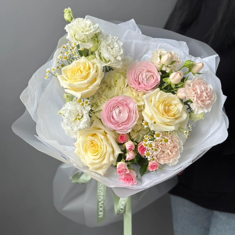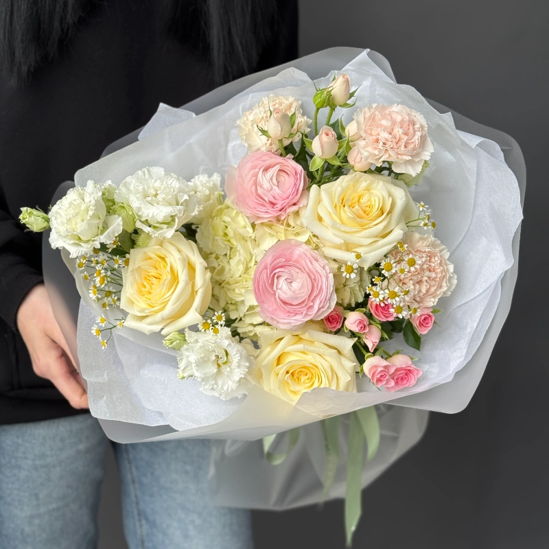 Изящное сочетание кремовых и розовых роз, пионовидных бутонов, нежных гвоздик и трогательных ромашек создаёт атмосферу лёгкости и романтики. Каждый цветок в этом букете — словно прикосновение тёплого весеннего ветра.