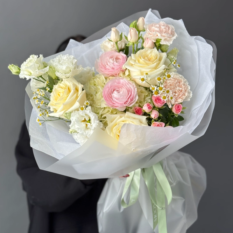 Нежная пастельная гамма, воздушная упаковка и утончённая лента делают композицию по-настоящему изысканной.