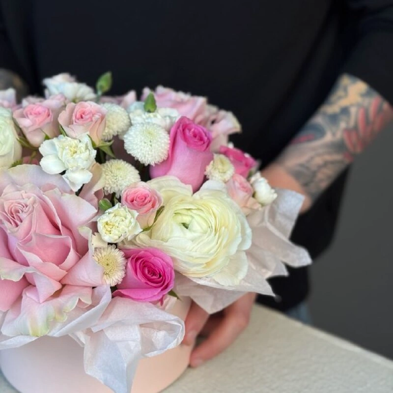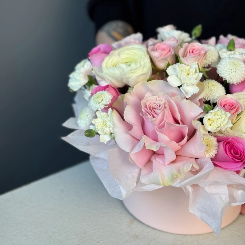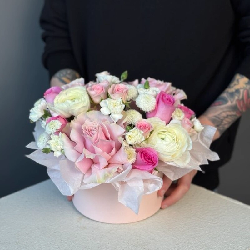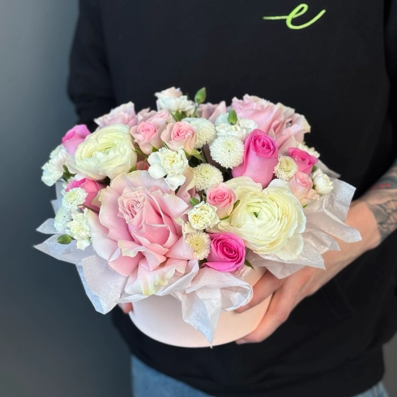 Элегантность в деталях: композиция из роз, ранункулюсов и нежных акцентов в пастельных оттенках. Премиальная упаковка делает эту композицию по-настоящему особенным подарком.