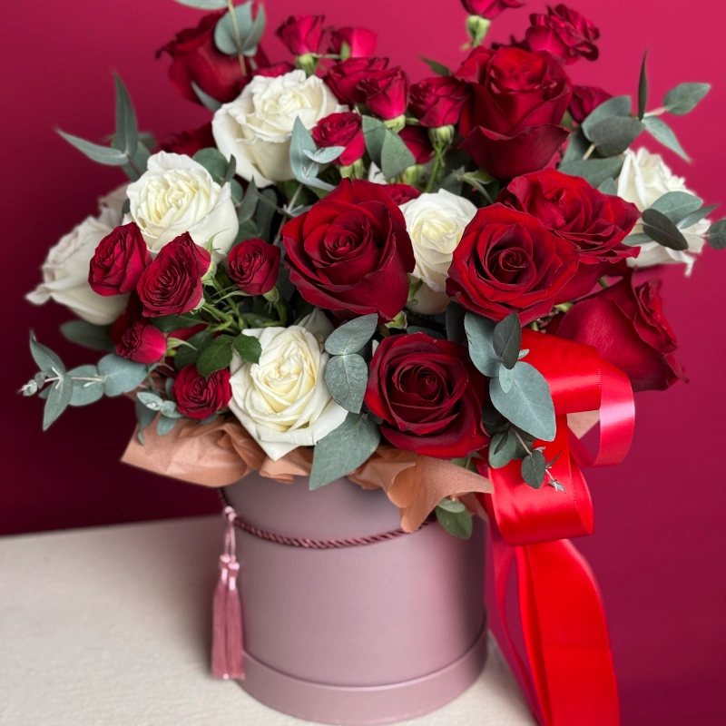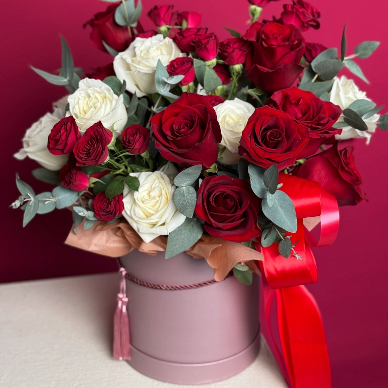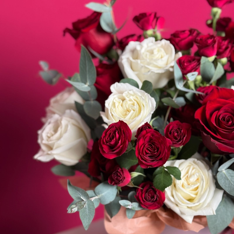 Композиция, в которой красные и белые розы гармонично дополняют друг друга. Эвкалипт придаёт объём и свежесть, а стильная коробка с лентой завершает образ.
