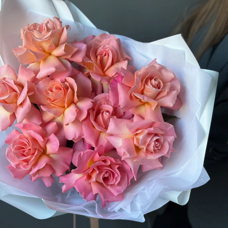 Нежные персиково-розовые розы в элегантной белой упаковке — идеальный подарок для особенного момента! 🌸