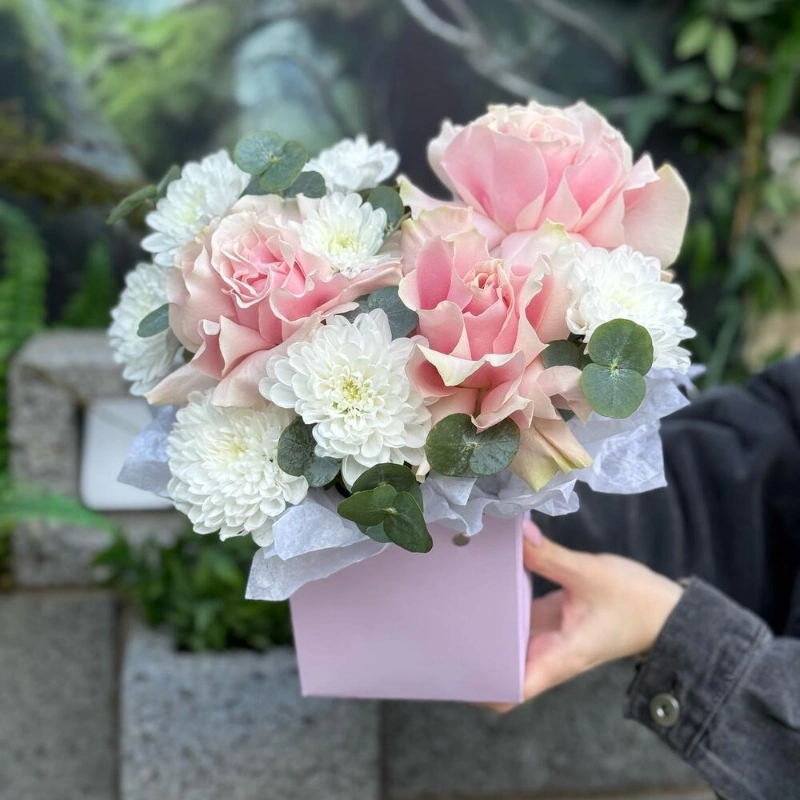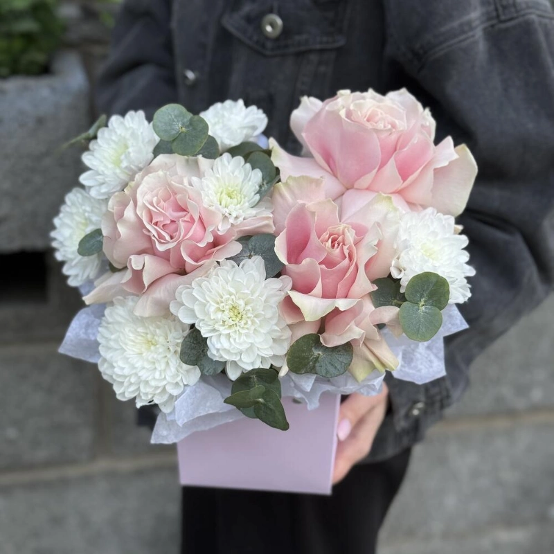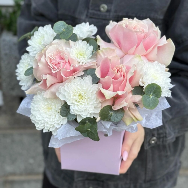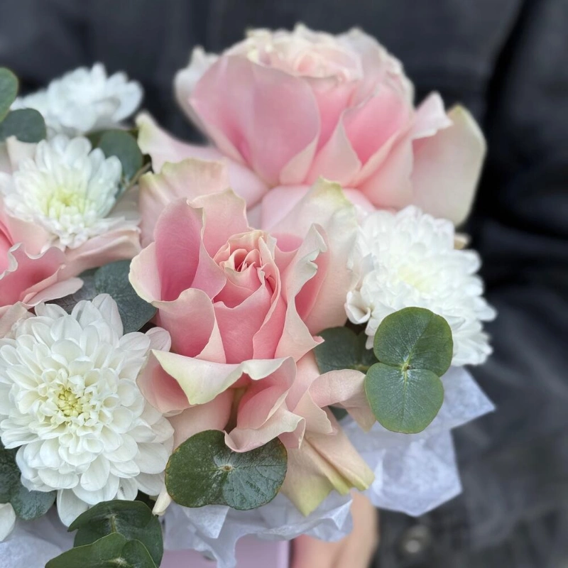Композиция в коробке с розами и эустомой