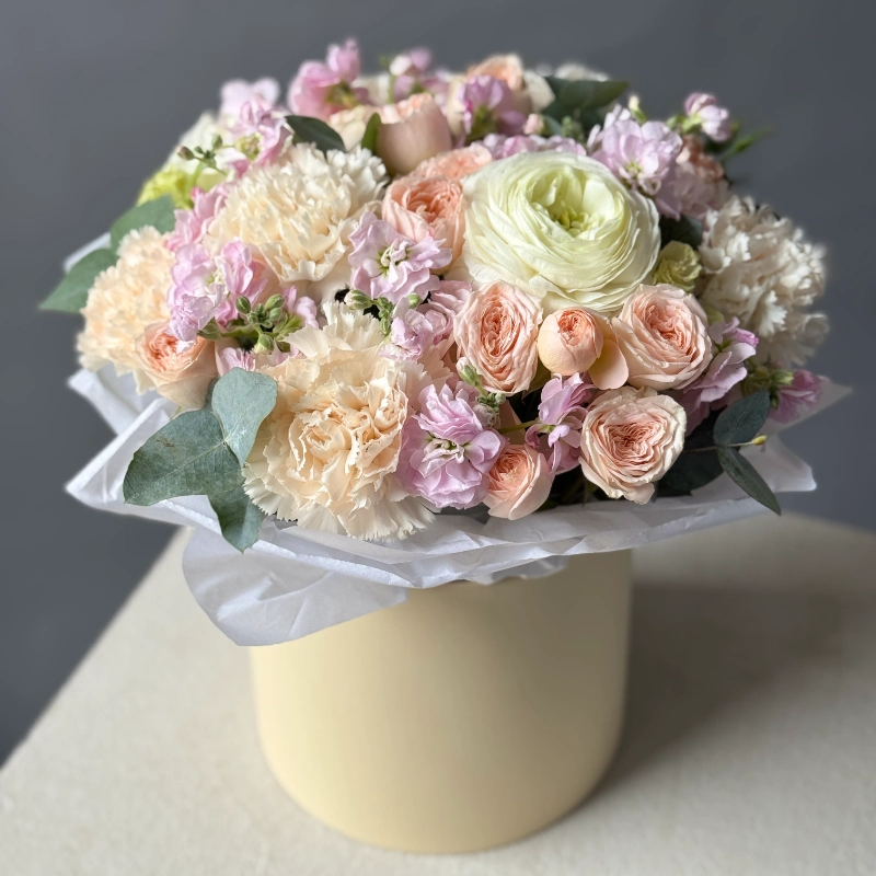 Композиция в коробке «Кремовый бриз» с ранункулюсами и маттиолой