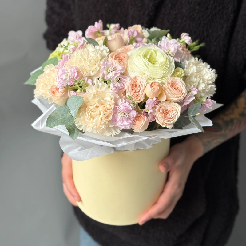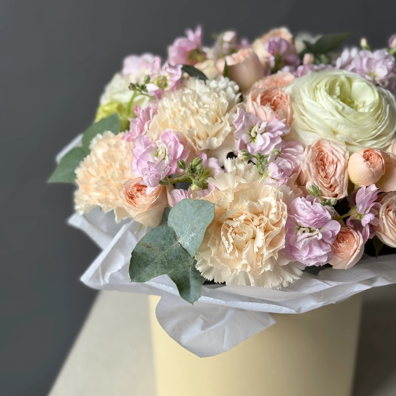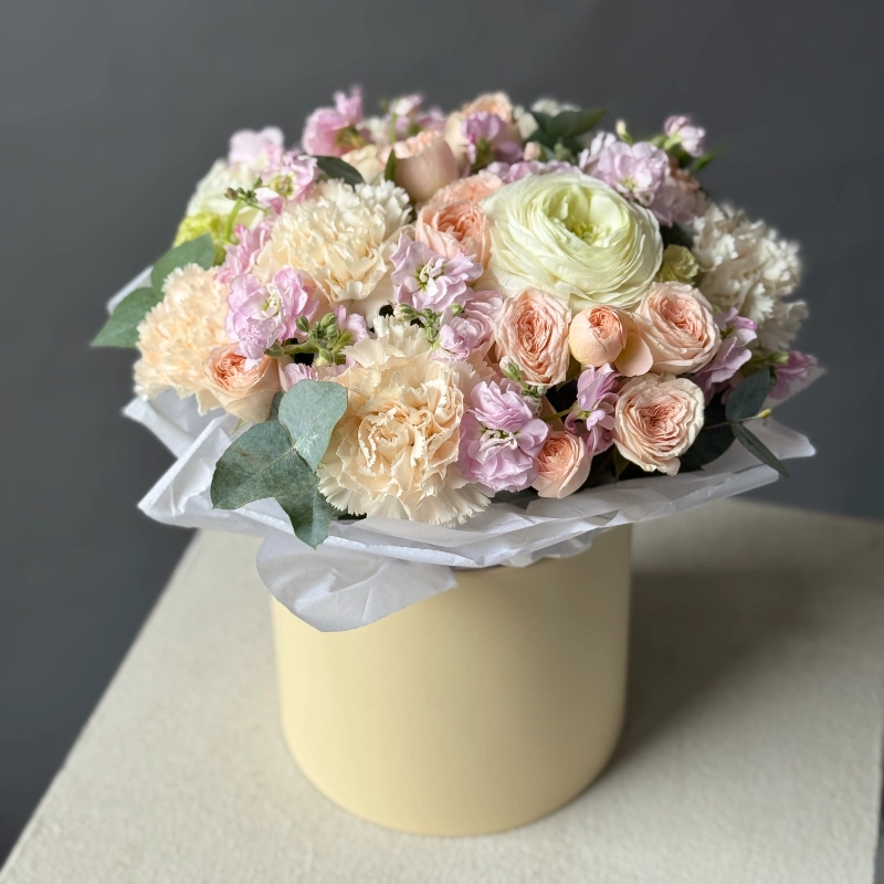 ГлавнаяКаталогКомпозицииКомпозиция в коробке «Кремовый бриз» с ранункулюсами и маттиолой