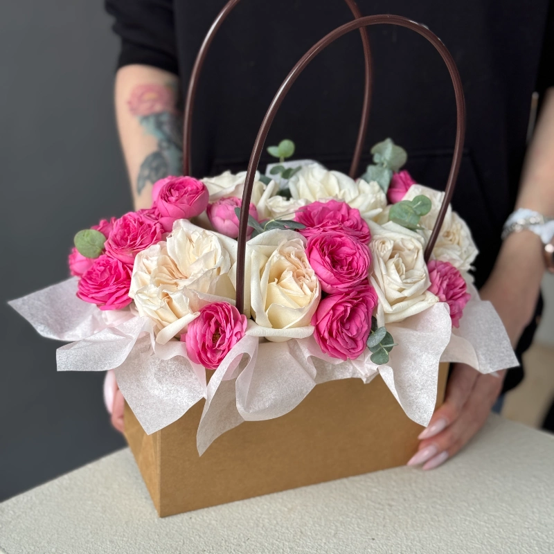 Цветы в сумочке N2 с ранункулюсами