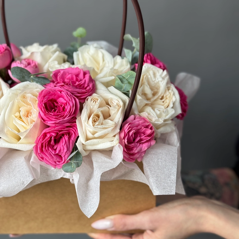 ГлавнаяКаталогКомпозицииВ сумочкеСумочка с пионовидными розами
