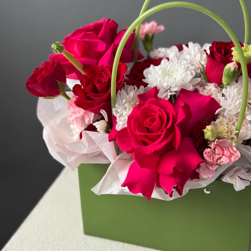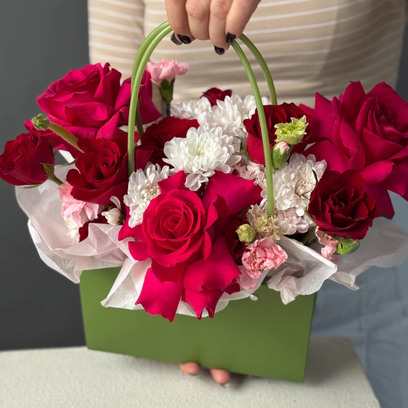 ГлавнаяКаталогКомпозицииСумочка с французскими розами сорта Гоча