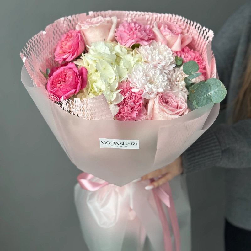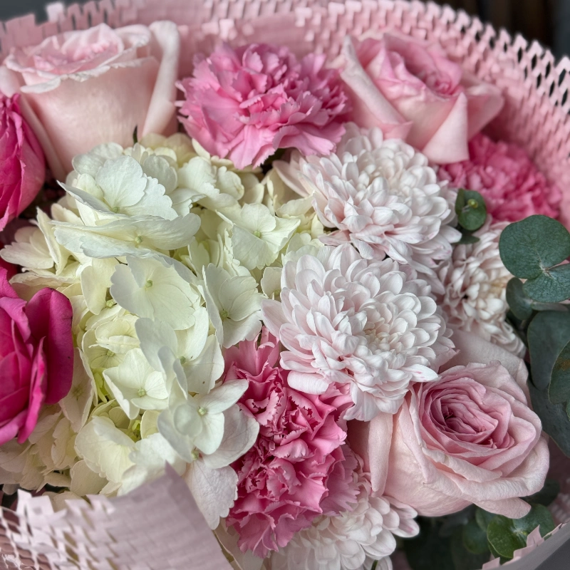 Розовые розы, гортензия, хризантемы — это букет, который покорит с первого взгляда!
