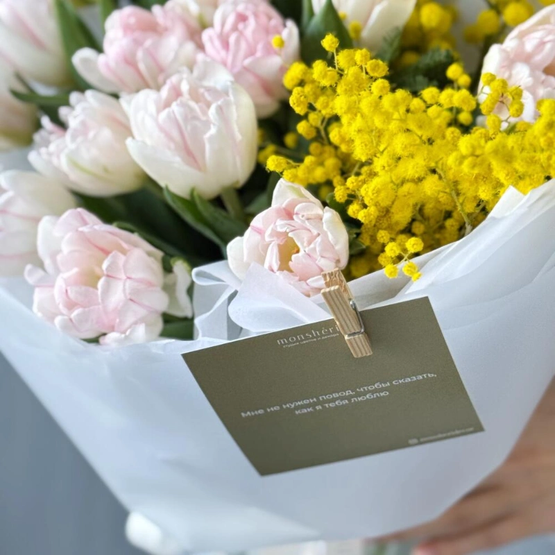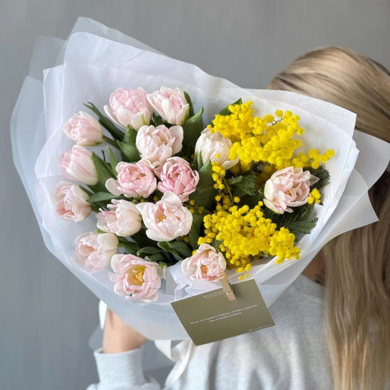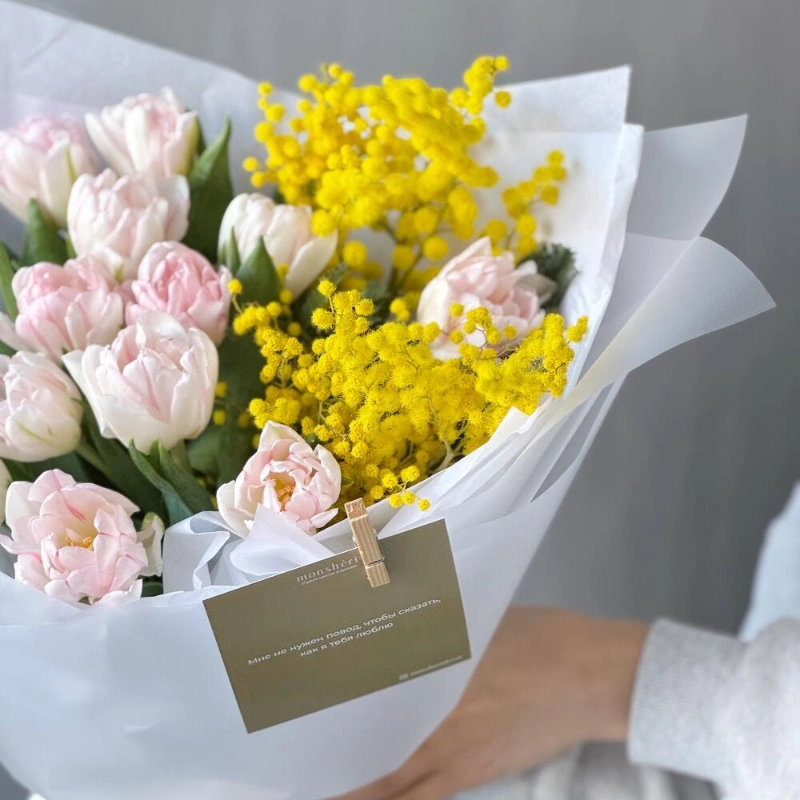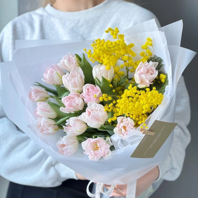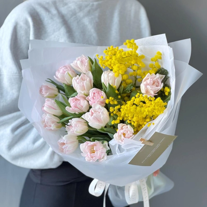 Яркая мимоза и нежные тюльпаны- весеннее настроение в одном букете!
