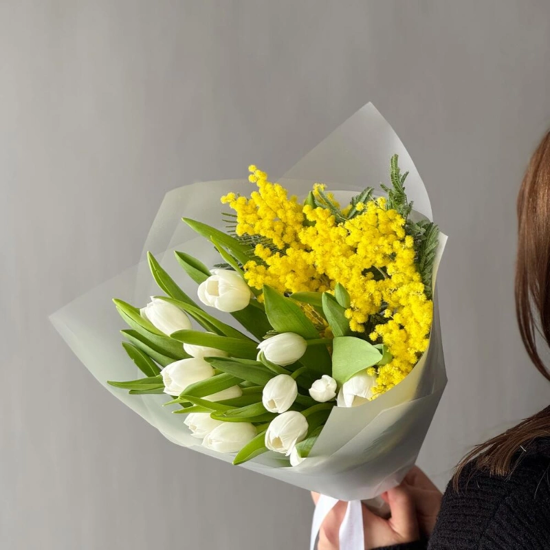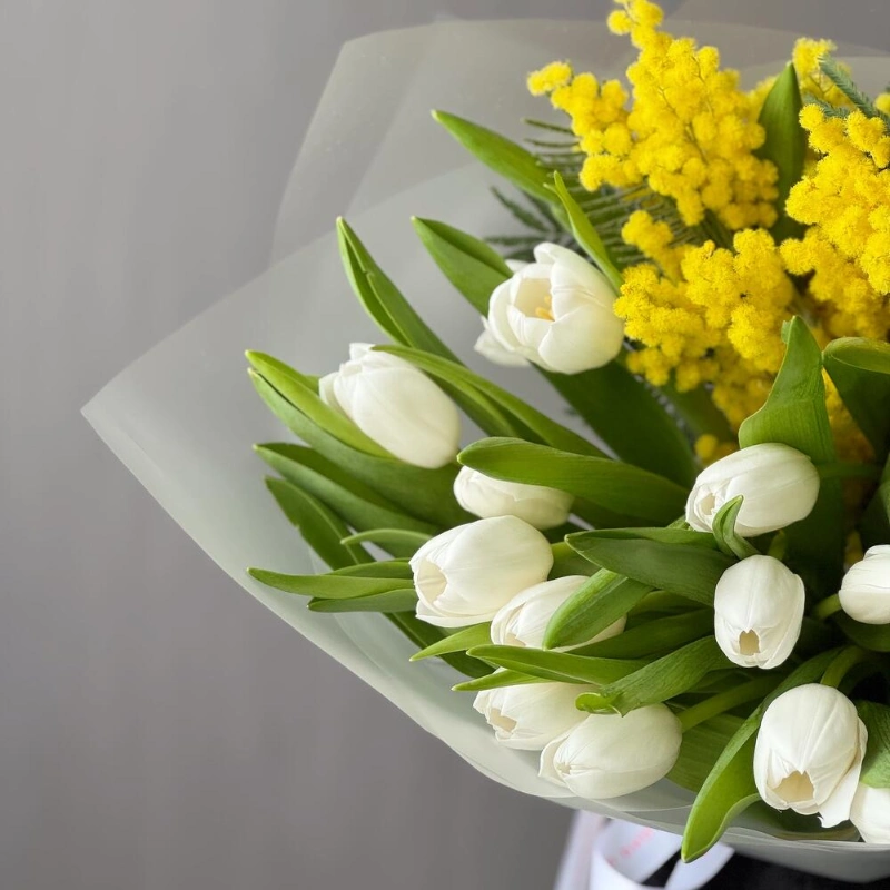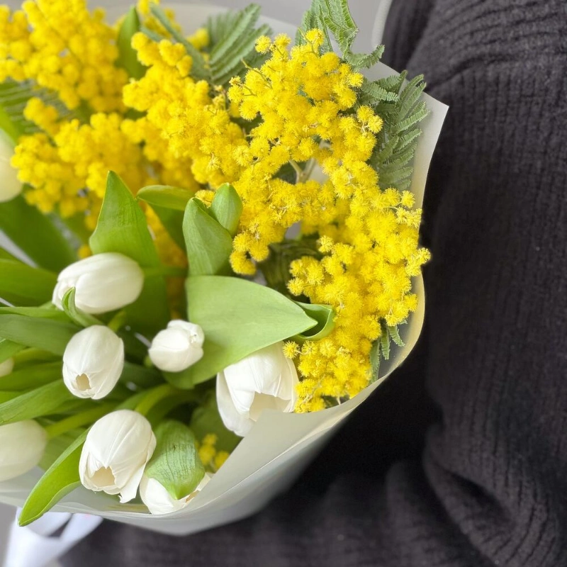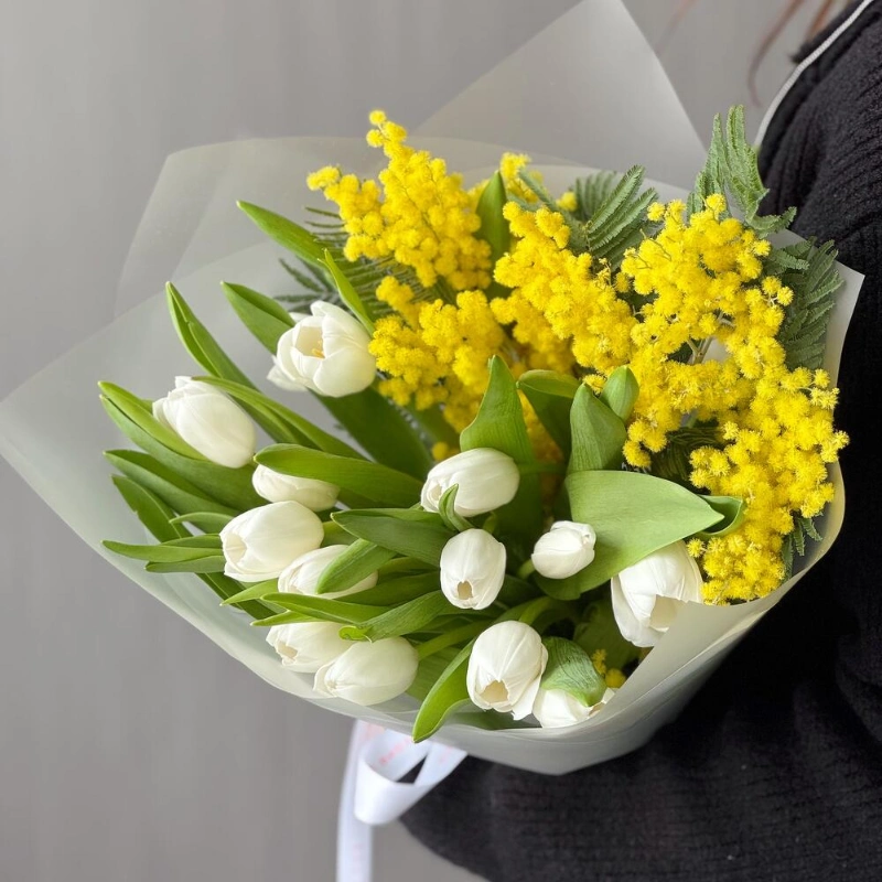 Яркое сочетание весенних красок мимозы и белоснежных тюльпанов✨