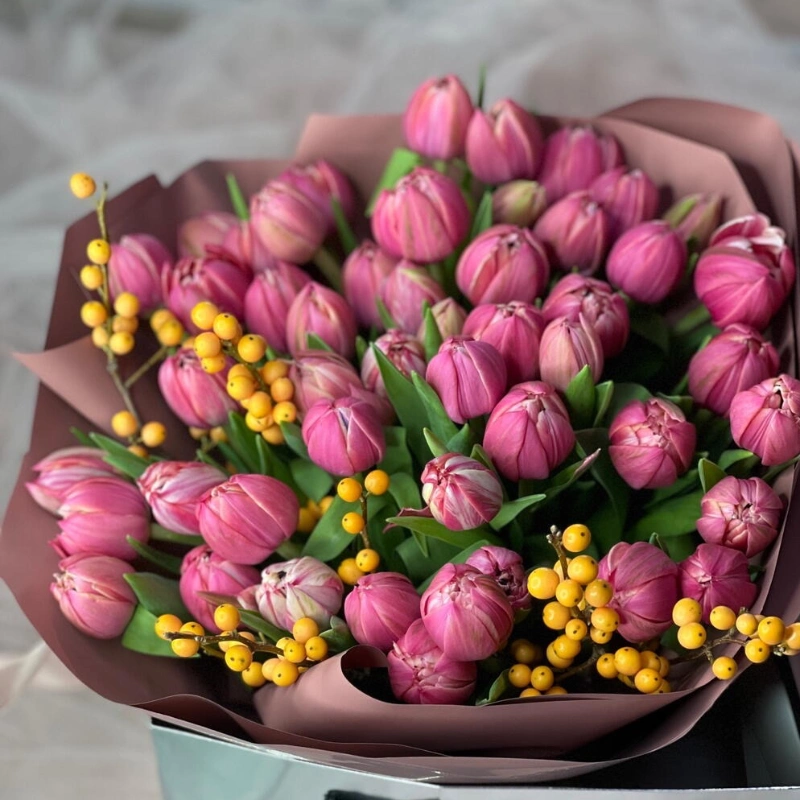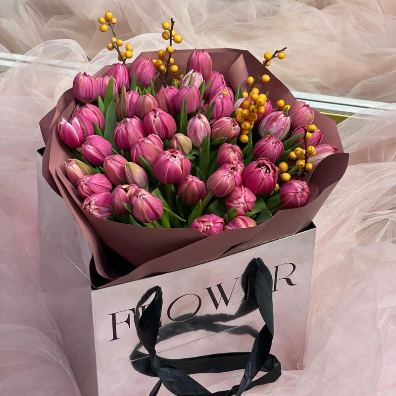 Тюльпан «Колумбус» зачаровывает своей экзотической красотой. У каждого цветка по 20 лепестков, окраску и узор которых с любовью создавала художница природа😍 В модной транспортировочной коробке. Бережная доставка лично в руки получателю. Весной желтый Илекс заменяется на желтую мимозу ❤️