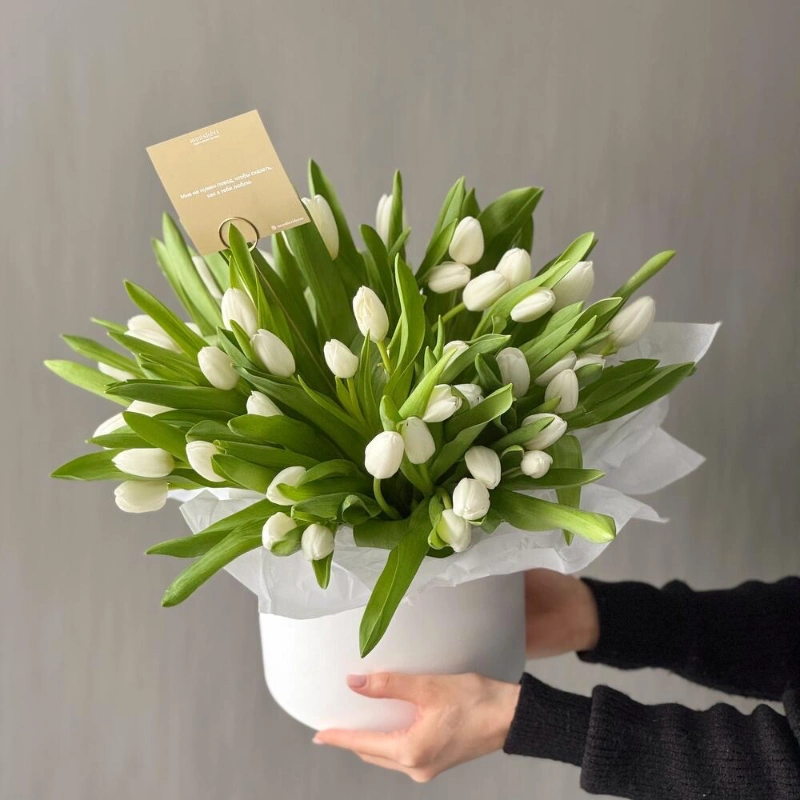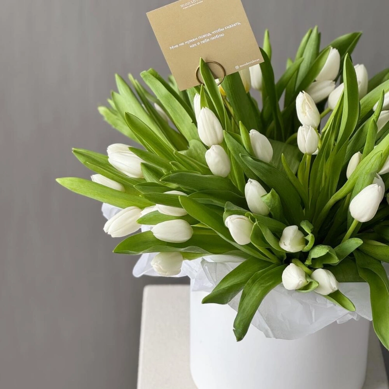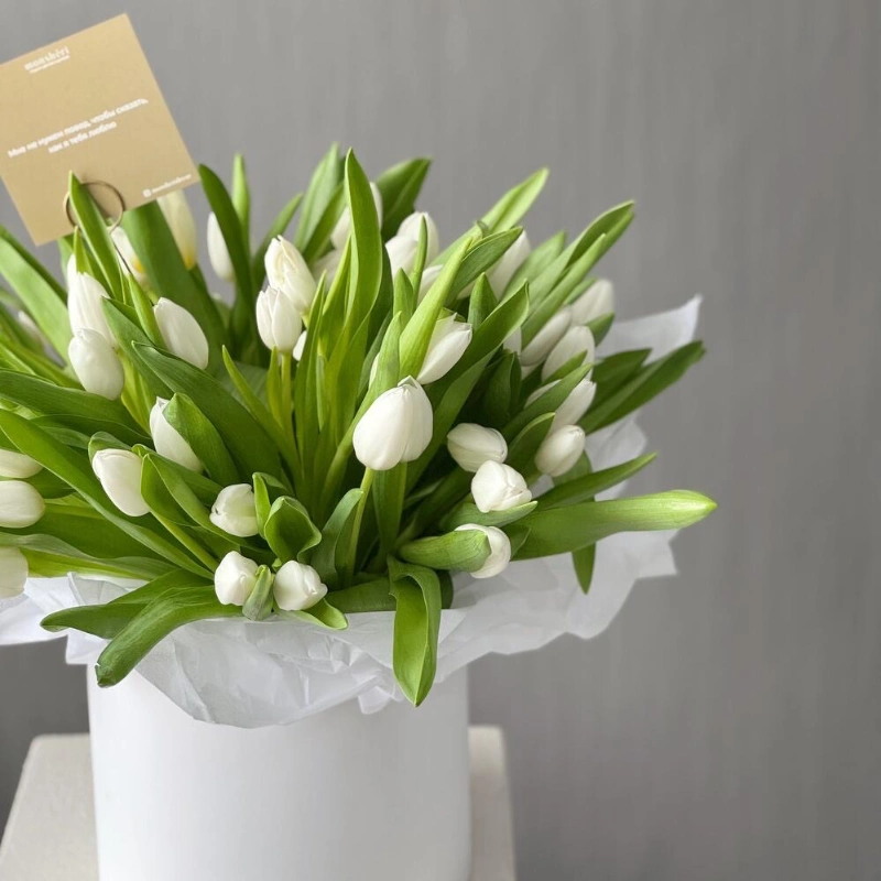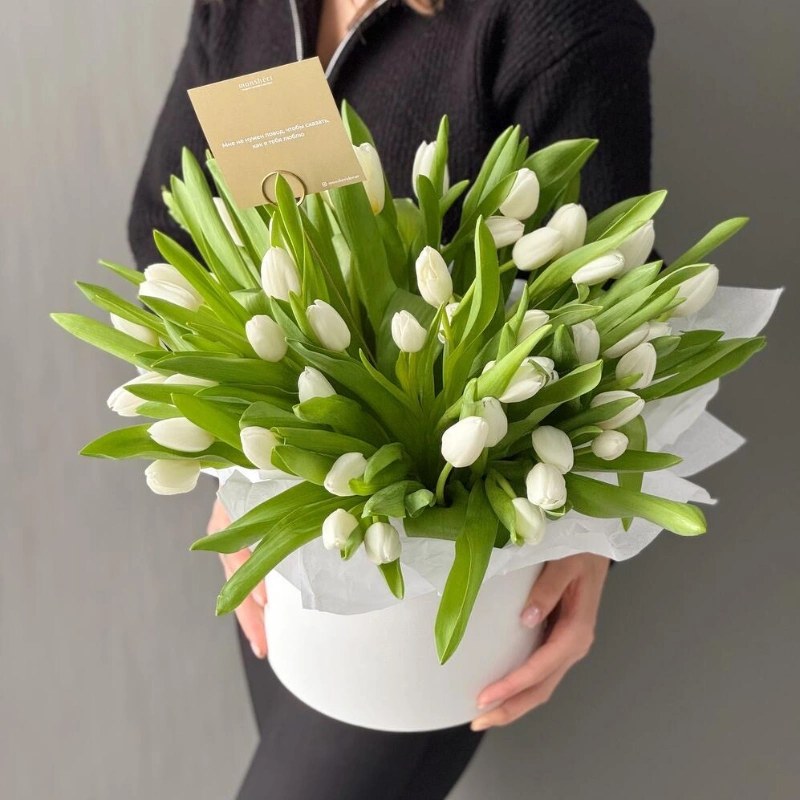 Весенняя шляпная коробка из хрустящих белоснежных тюльпанов