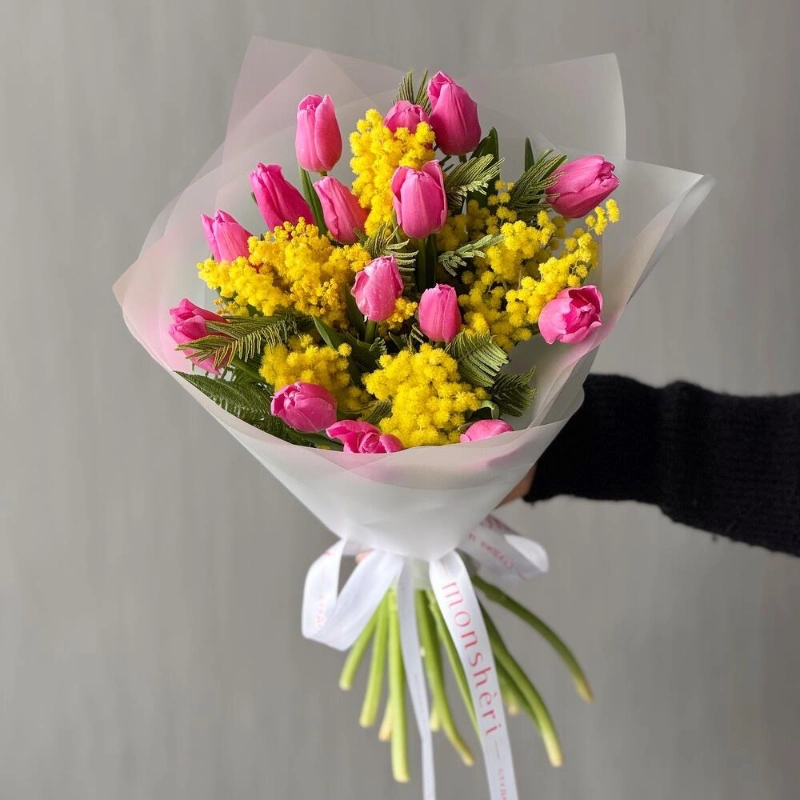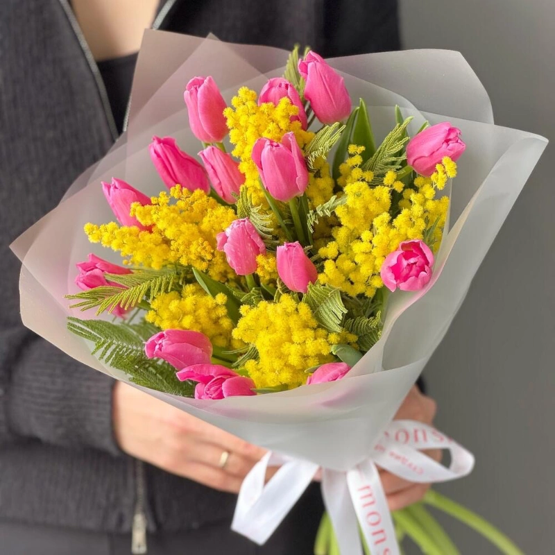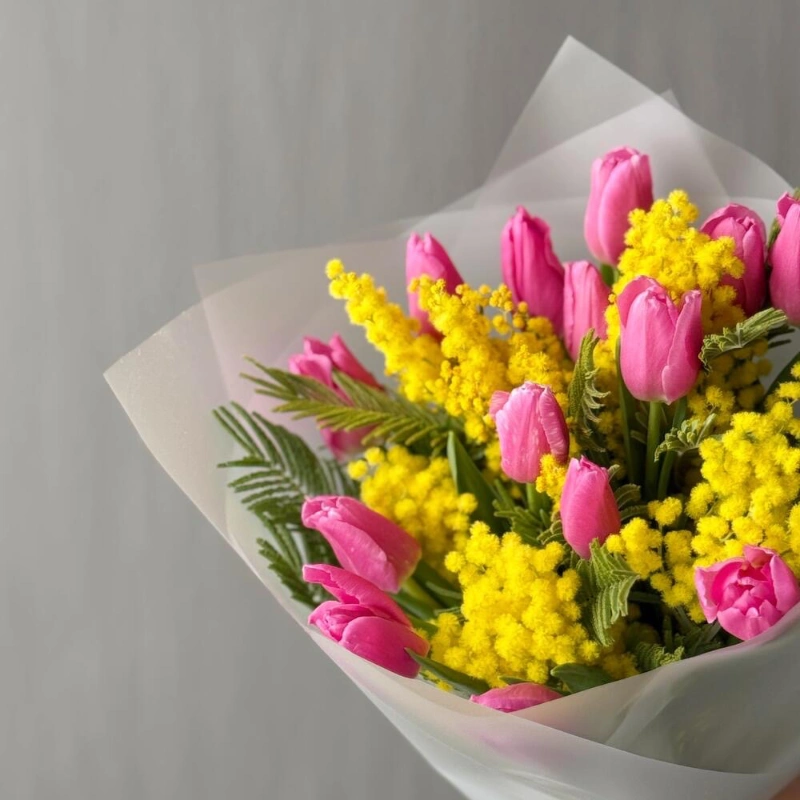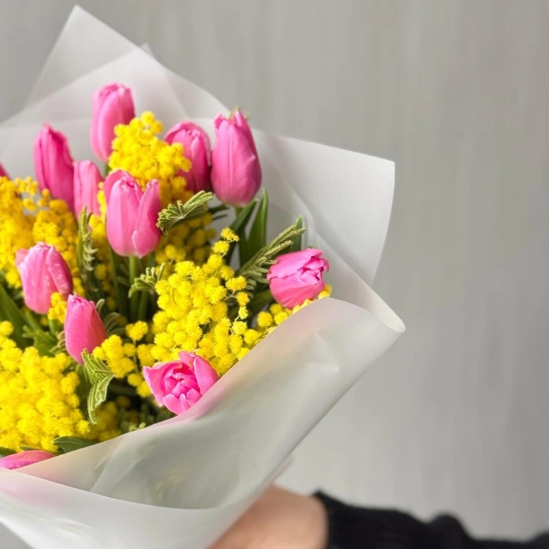 Нежные розовые тюльпаны в сочетании с яркой мимозой✨