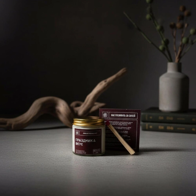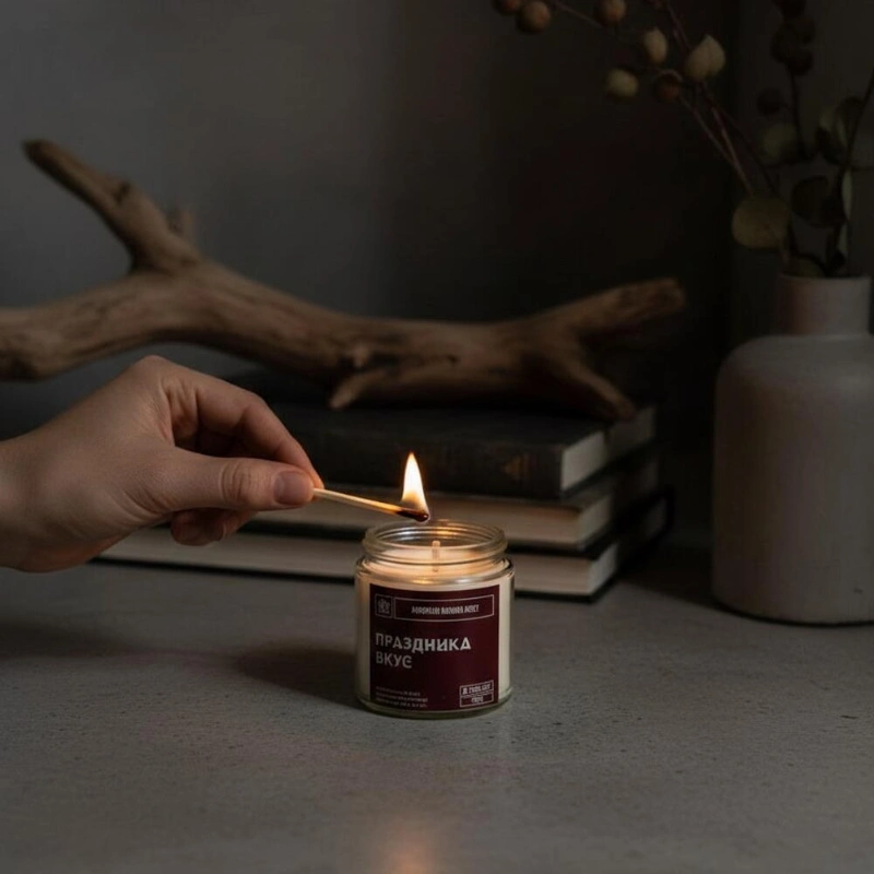 Ароматическая свеча «Праздника вкус»НотыTOP - лайм, десертная вишняHEART - ваниль, листья кокиBASE - мускатный орехУпаковка: крафтовая коробочка, инструкция, спичкиОбъем 120млМатериалСостав: 100% натуральные воски кокосовый и оливковый, ароматическая отдушка, фитиль хлоковый.РазмерШирина - 5 смВысота - 7 см